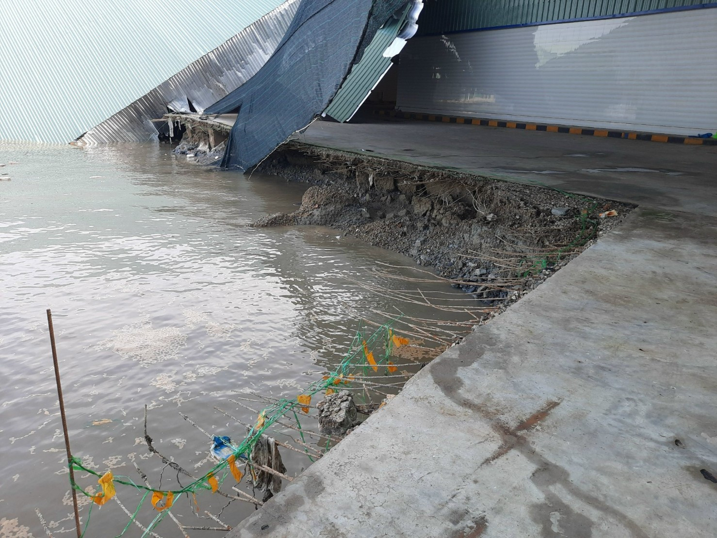 Theo đó, vụ sạt lở nghiêm trọng xảy ra vào khoảng hơn 23h ngày 6/7, tại khu vực phía sau nhà xưởng của Công ty TNHH Dương Lộc Tiến (ở ấp 4, thị trấn Gành Hào) chuyên sản xuất bột cá. Vị trí sạt lở đất có xây dựng kè bê tông dài 50m, rộng 40m.