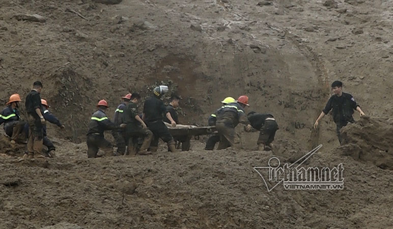 | Đưa thi thể nạn nhân ra khỏi khu sạt lở. Ảnh: Trần Thường |