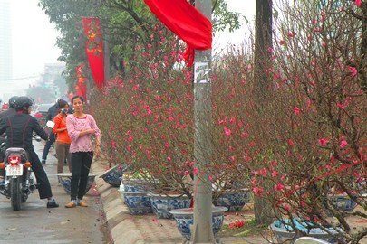 Trên các phố: Hoàng Quốc Việt, Hồ Tùng Mậu, Nghi Tàm, Lạc Long Quân… đào tràn ngập hè phố với đủ loại từ đào cành, đào rừng đến quất dáng… loại to nhỏ có cả. Nhiều con đường dân buôn còn tận dụng tất cả những chỗ trống được cho là tuận tiện để trưng đào quất bán. Thậm chí, đằng sau một trạm ngồi chờ xe buýt, dân buôn cũng có thể tận dụng làm “kho” để những cành đào bán.