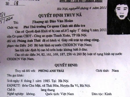 | Quyết định truy nã của công an TP.Hà Nội cuối tháng 4/2011 đối với Phùng Anh Thái (tức Thái “côn”) về hành vi “gây rối trật tự công cộng”. |