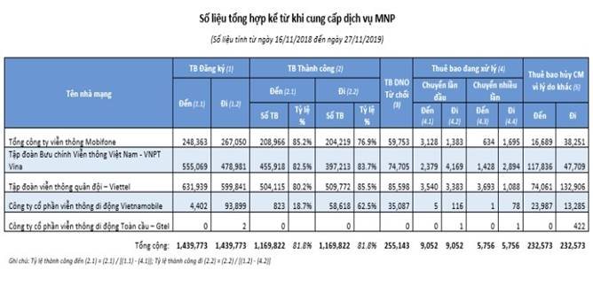 Theo số liệu thống kê mới nhất của Cục Viễn thông của Bộ TT&TT, sau một năm chính thức triển khai dịch vụ chuyển mạng giữ số tại Việt Nam, từ ngày 16/11/2018 đến ngày 27/11/2019, đã có tổng cộng 1.439.773 thuê bao đăng ký chuyển mạng giữ số, trong đó, số khách hàng chuyển mạng giữ nguyên số đã thực hiện thành công là 1.169.822. Tỷ lệ chuyển mạng giữ số thành công của các nhà mạng trong một năm qua lần lượt là MobiFone (76,9%), VinaPhone (83,7%), Viettel (85,5%) và Vietnamobile (62,5%).
