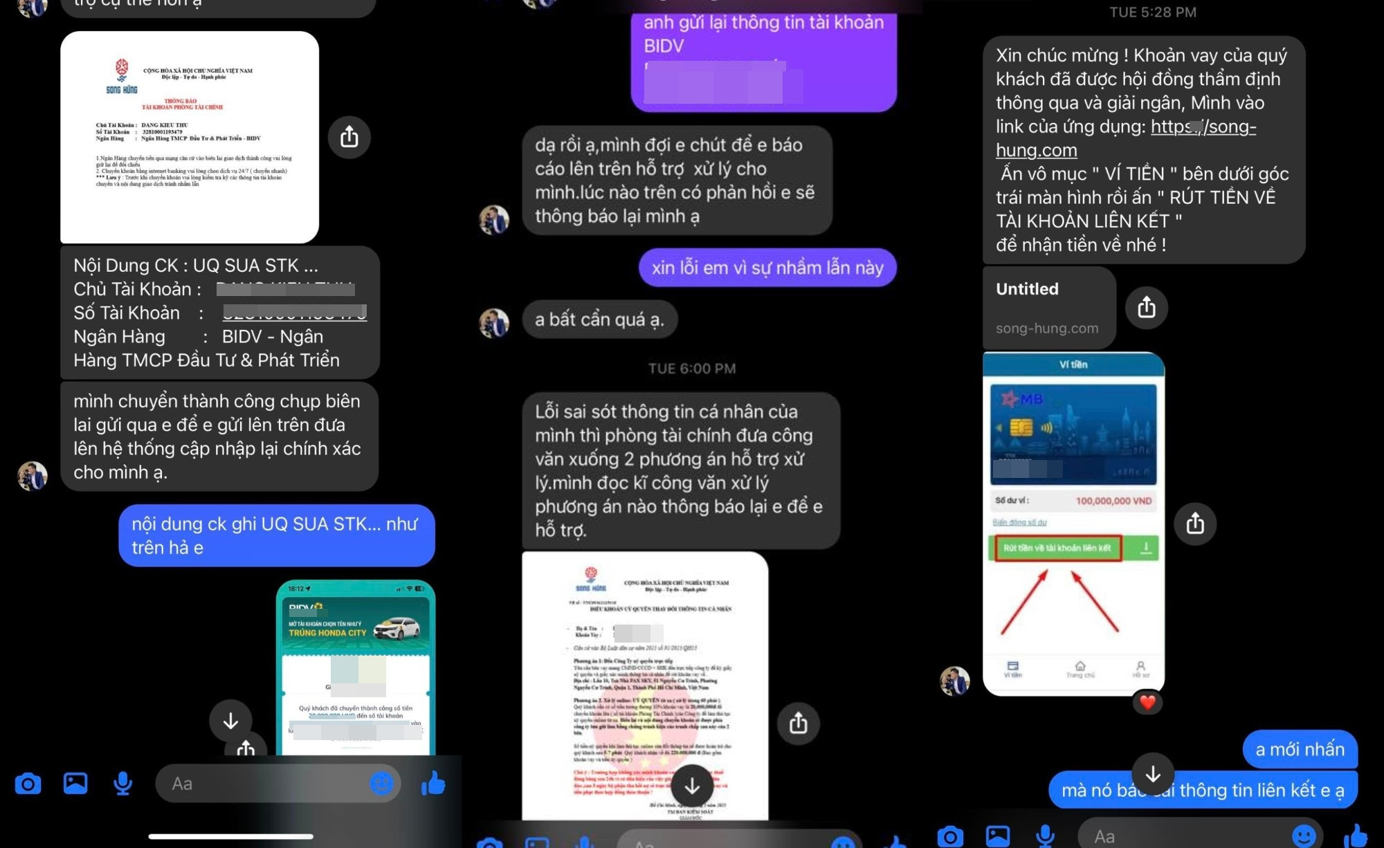 Sau khi khoản vay được phê duyệt, T. bấm nút tải từ ví điện tử của công ty về tài khoản nhưng bị lỗi. Liên hệ với Trần Thông Dũng – người tự xưng chăm sóc khách hàng của công ty trên – anh ta nói do T. nhập sai số tài khoản.