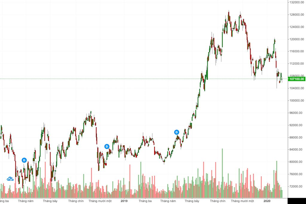 Trước khi đạt mức cao chưa từng có này, mã MWG có một chặng phát triển thăng hoa từ tháng 4/2019 đến cuối năm ngoái. Từ mức khoảng 80.000 đồng/CP, trong khoảng nửa năm phát triển dựng đứng, mã này đạt mốc 120.000 đồng, tức tăng trưởng lên đến 50%.