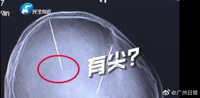 Người phụ nữ 29 tuổi đến từ Trịnh Châu từng bị tai nạn xe hơi và được khuyên nên chụp CT để đảm bảo không có tổn thương nào ở đầu. May mắn thay, cuộc kiểm tra cho thấy không có chấn thương nào liên quan đến vụ tai nạn. Nhưng cuộc kiểm tra này lại cho một kết quả khá bất ngờ: hai cây kim, dài khoảng 5cm và đường kính 4,9mm cắm sâu trong não của cô. Điều kỳ lạ là những chiếc kim này không liên quan đến vụ tai nạn xe hơi, vì không có vết thương nào ở sọ não hay da đầu, và người phụ nữ không có hồi ức về bất kỳ chấn thương đầu nghiêm trọng nào trước đó.