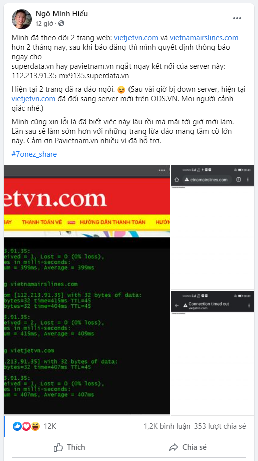 Trong bài đăng trên nhóm của mình, anh Hiếu cho biết, anh đã theo dõi 2 trang web này từ hai tháng nay, nhưng chỉ đến khi nhiều bài báo cảnh báo về các website giả mạo bán vé máy bay để lừa đảo người dùng, anh mới quyết định thông báo cho nhà cung cấp tên miền để ngắt kết nối các website này.