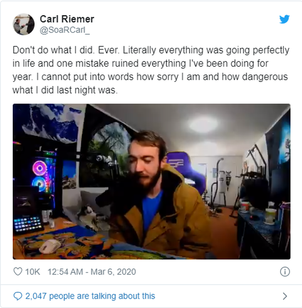 Câu chuyện nghe như đùa mà hóa ra lại là sự thật. Nhân vật chính lần này chính là anh chàng Carl Riemer - game thủ Call of Duty của tổ chức eSports SoaR và là streamer khá nổi tiếng trên toàn thế giới. Đáng nhẽ, nếu cứ duy trì vị thế của mình, Carl sẽ chẳng phải lo nghĩ gì về thu nhập hay cuộc sống khi mà lượng người xem của anh chàng luôn được giữ ở mức đông đảo, trong khi số tiền kiếm về từ tổ chức và các nền tảng stream cũng không phải dạng vừa đâu. Thế nhưng, chỉ một hành động tai hại, anh chàng đã tự tay vứt bỏ đi toàn bộ cơ nghiệp của mình.