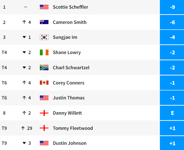Smith là người duy nhất có thành tích dưới 70 gậy trong ngày thứ 3, với 6 birdie và 2 bogey. Golfer người Australia bứt lên 4 vị trí, chỉ đứng sau Scheffler với tổng điểm gậy -6.