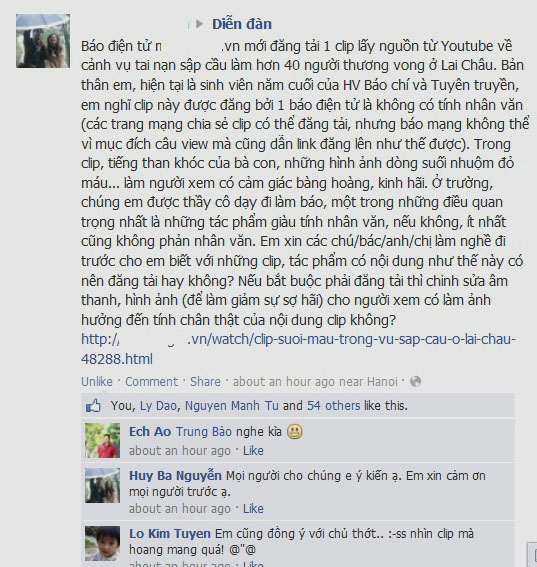 Bi thương đến nỗi mà nhiều người đã kêu gọi báo chí không đăng nguyên lên các trang báo điện tử. Một bạn viết trên diễn đàn nhà báo: “Em nghĩ clip này được đăng bởi một báo điện tử là không có tính nhân văn… Nếu bắt buộc phải đăng tải thì chỉnh sửa âm thanh, hình ảnh để làm giảm sự sợ hãi cho người xem có làm ảnh hưởng đến tính chân thật của nội dung clip không?”.