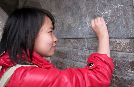| Cẩn trọng tẩy từng con chữ thiếu ý thức đã tồn tại bao nhiêu năm nay trên di tích |