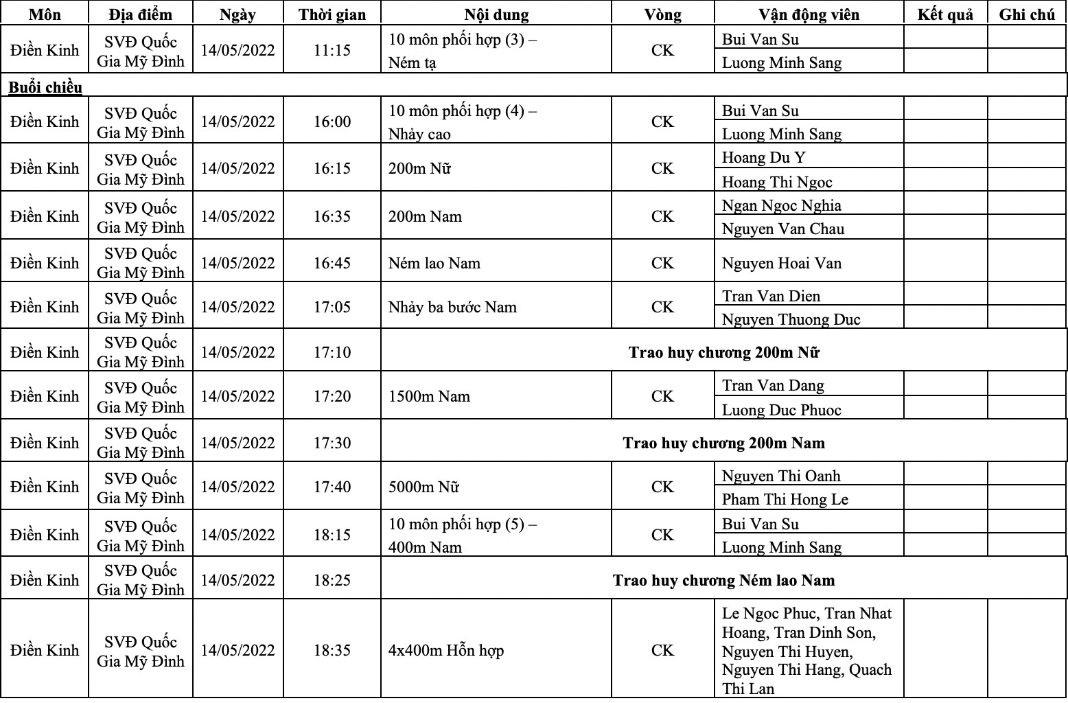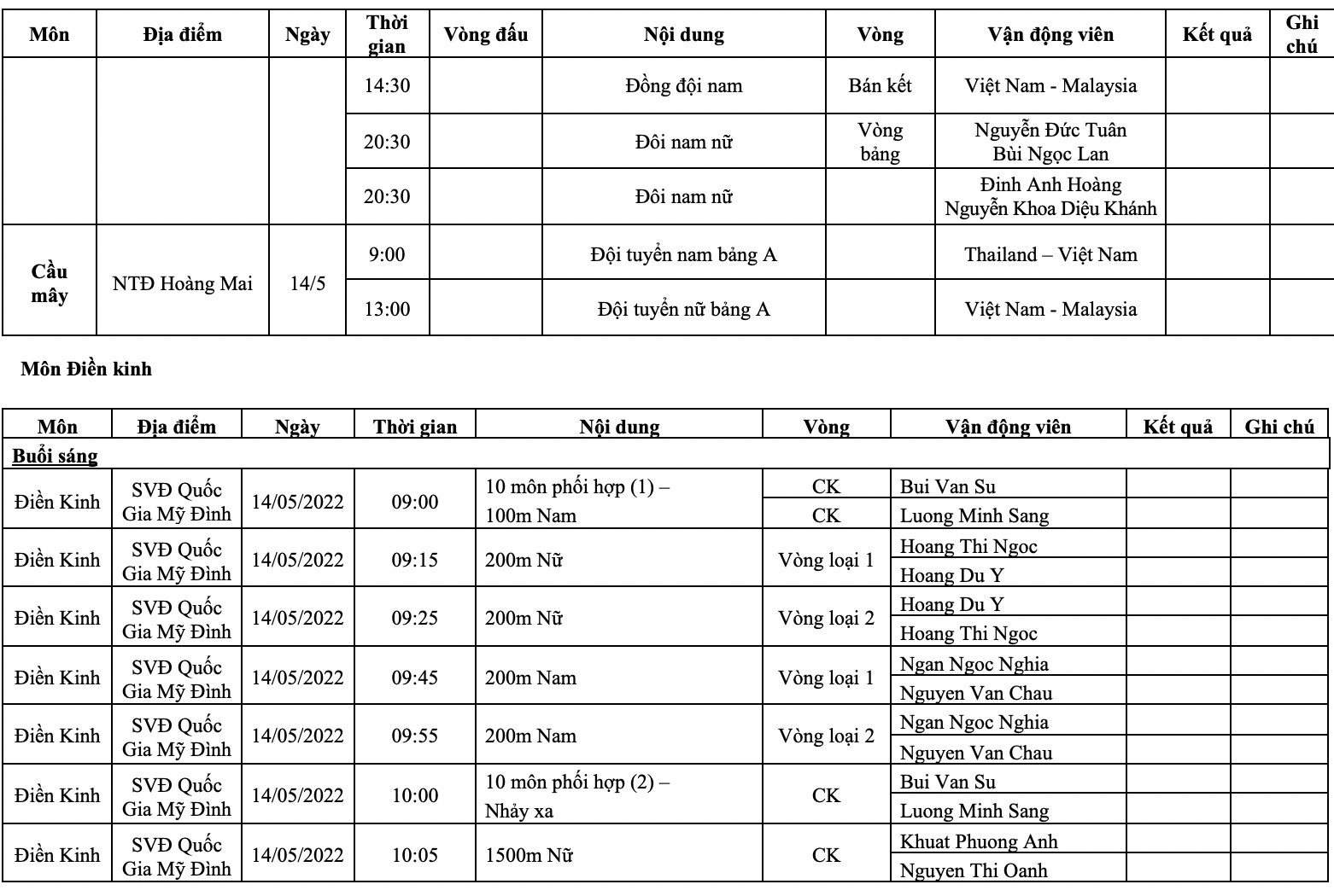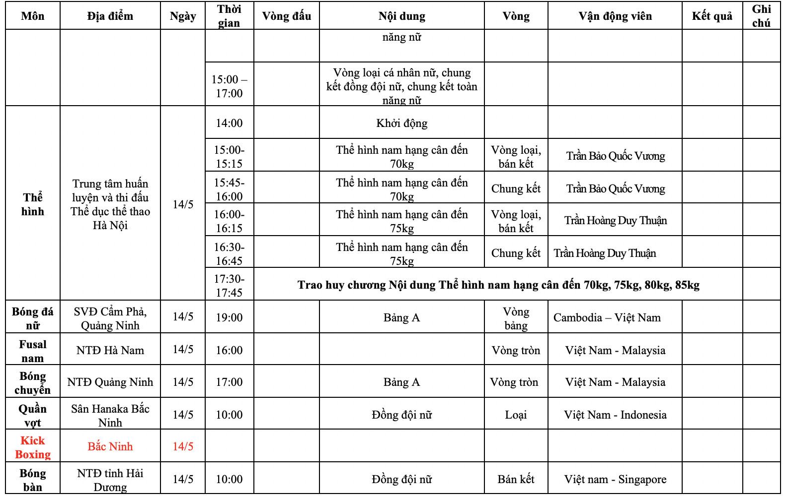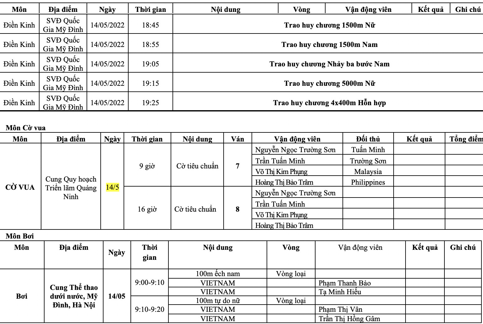 Ngày 14/5, đoàn TTVN tranh tài ở rất nhiều môn, hứa hẹn tiếp tục mang về "cơn mưa" HCV để giữ vững ngôi đầu trên BXH huy chương.