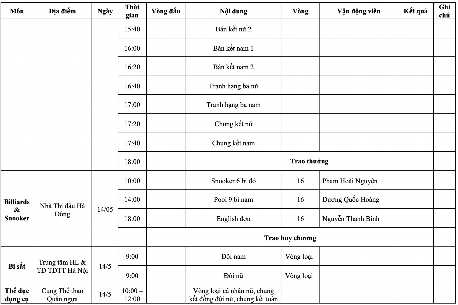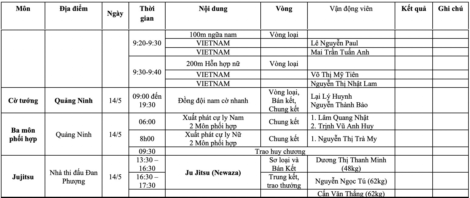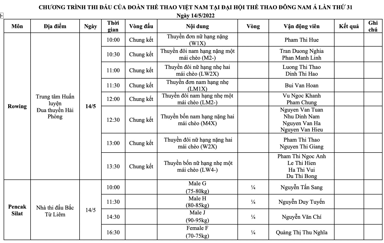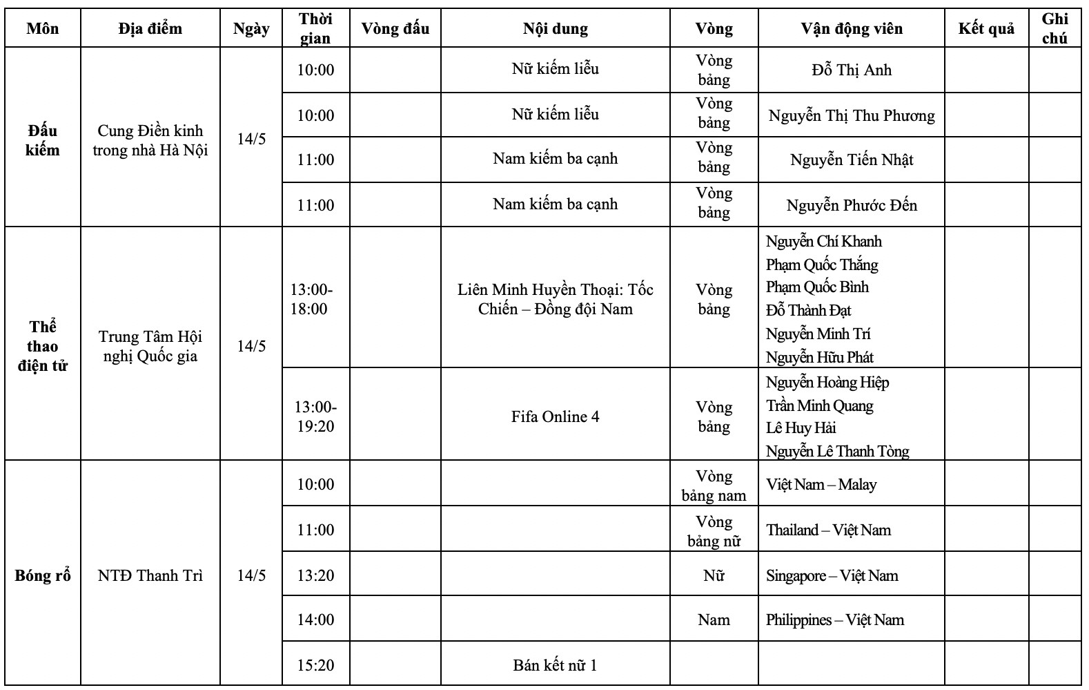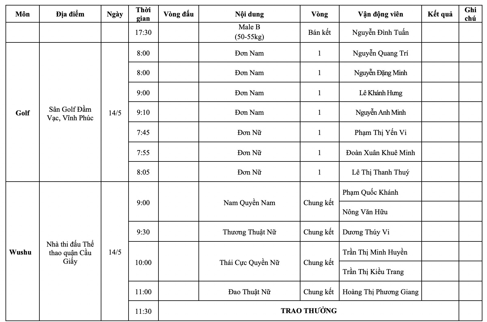 Cũng trong ngày 14/5, rowing có 8 nội dung chung kết, wushu 4 nội dung chung kết, bên cạnh đó là thể hình, đấu kiếm, thể dục dụng cụ... dự kiến tiếp tục mang về nhiều HCV cho đoàn TTVN.