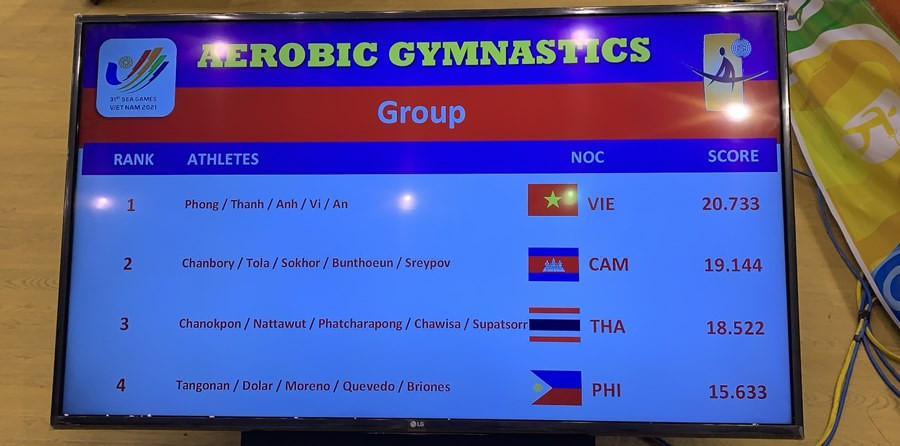 Các VĐV gồm Lê Hoàng Phong, Nguyễn Chế Thanh, Nguyễn Việt Anh, Trần Ngọc Thúy Vi và Vương Hoài An đạt điểm số cao nhất để giành HCV nội dung nhóm 5 hỗn hợp nam nữ.