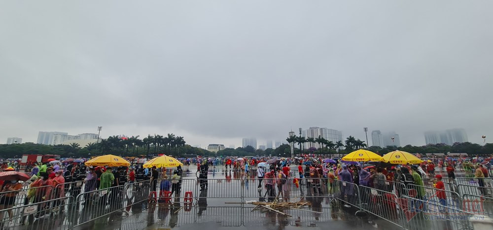 Thời điểm 2 tiếng 30 phút trước trận chung kết bóng đá nam giữa U23 Việt Nam vs U23 Thái Lan diễn ra (19h), CĐV đã kéo tới sân Mỹ Đình rất đông dù khu vực quảng trường sân vận động Quốc gia vẫn đang có mưa.