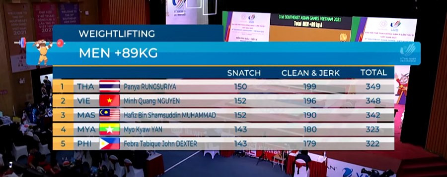 Đô cử Việt Nam đạt mức 187kg cử đẩy và tổng cử 334kg, xếp thứ hai sau VĐV của Indonesia (337kg) để giành tấm HCB hạng cân 89kg. Đại diện của Thái Lan đạt mức tổng cử 325kg để đoạt HCĐ.