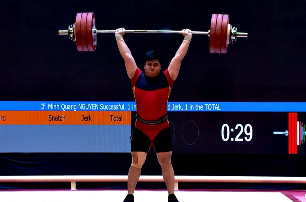 Bùi Tuấn Anh đang tranh tài ở hạng cân 89 kg của nam. Đô cử của Việt Nam hoàn thành mức tạ 147kg ở nội dung cử giật.