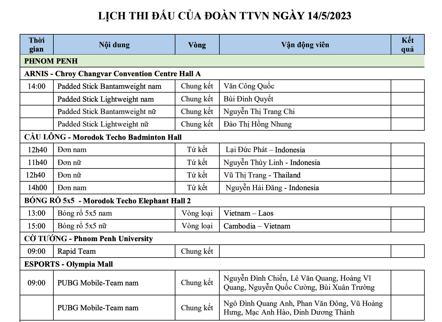 Trong ngày thi đấu 14/5, môn lặn được dự đoán mang về thêm từ 4-5 HCV trong tổng số 8 nội dung chung kết. Ngoài ra, một thế mạnh khác của Việt Nam cũng bắt đầu tranh tài là vật.