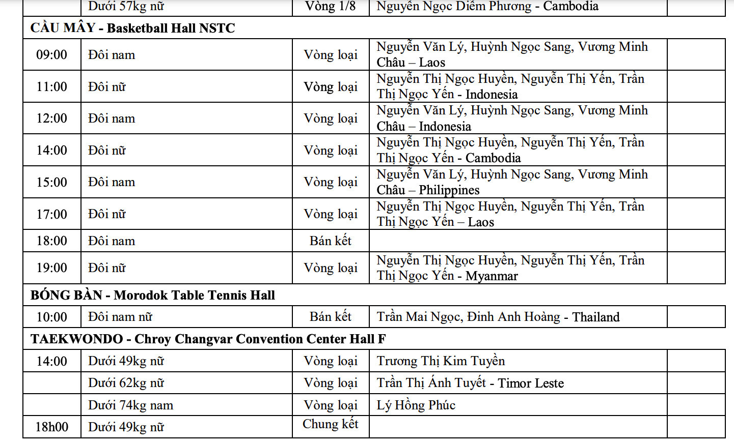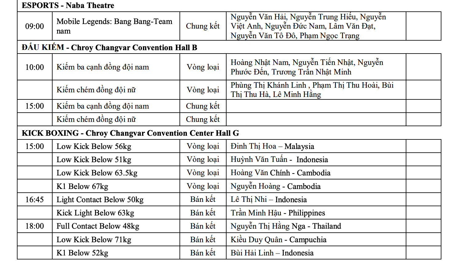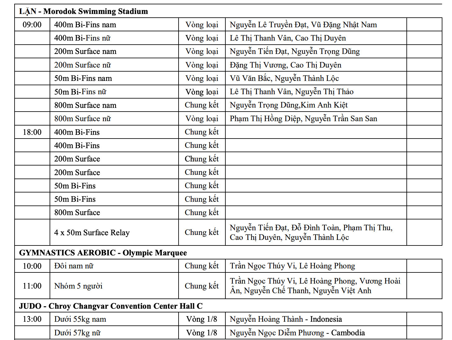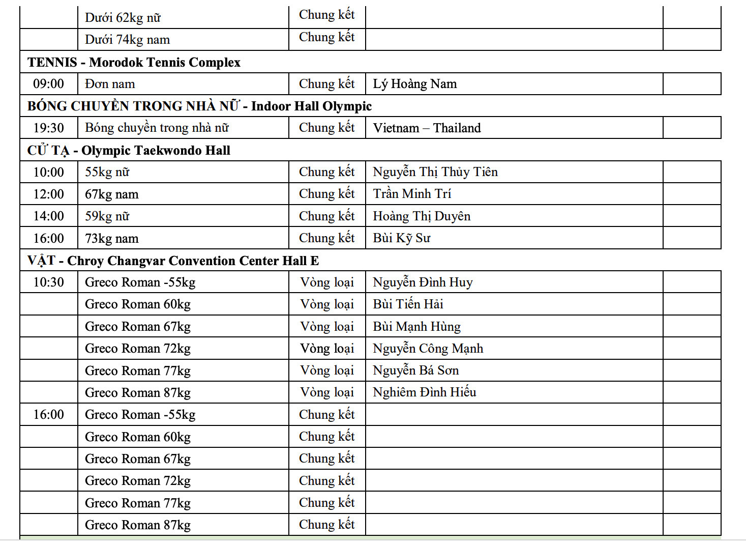 Aerobic với 2 nội dung chung kết được kỳ vọng giành 1 HCV, trong khi ở môn tennis, Lý Hoàng Nam bước vào trận bảo vệ HCV ở nội dung đơn nam.