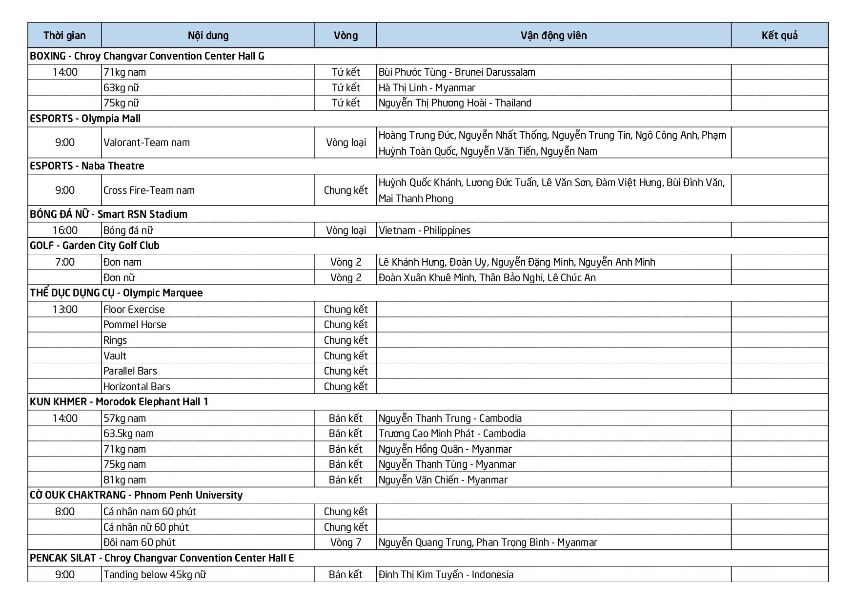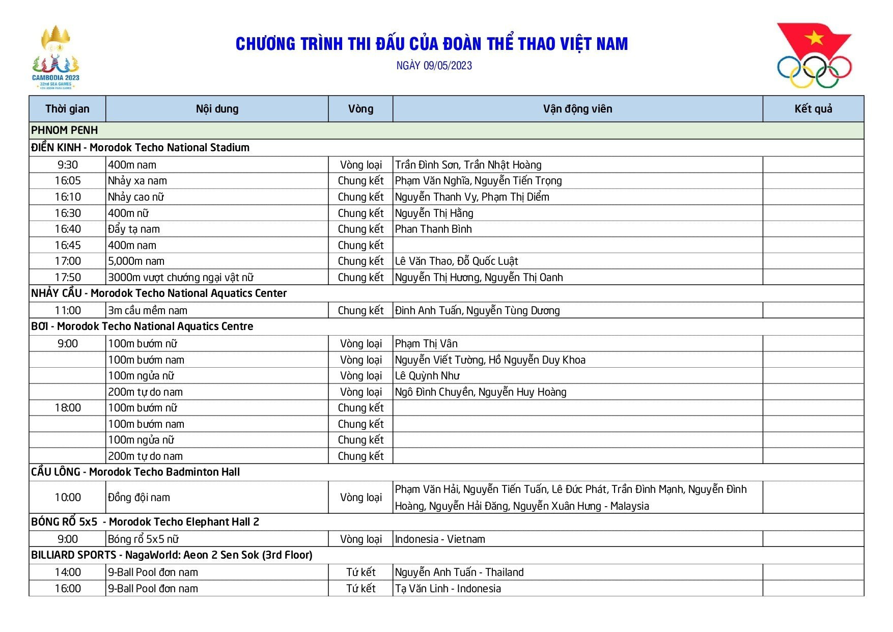 Các môn khác có thể đóng góp HCV cho đoàn TTVN trong ngày 9/5 còn có bi sắt, tennis, vovinam, pencak silat, cờ ốc, TDDC...