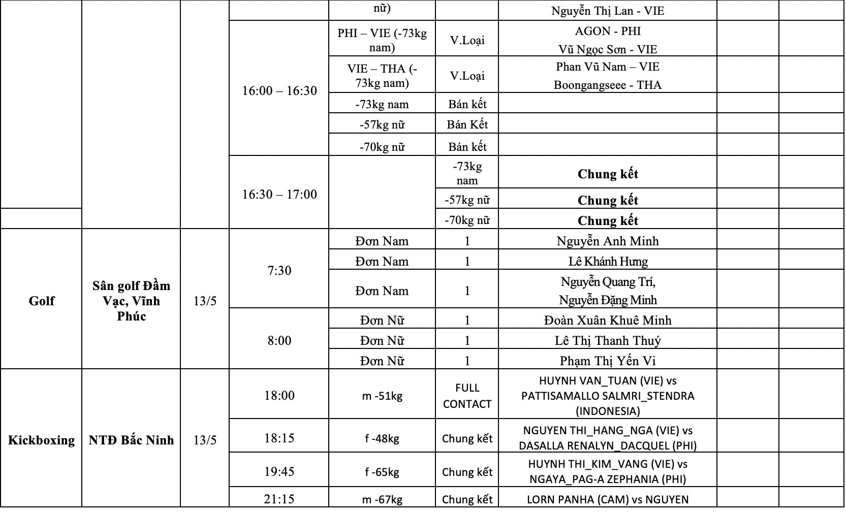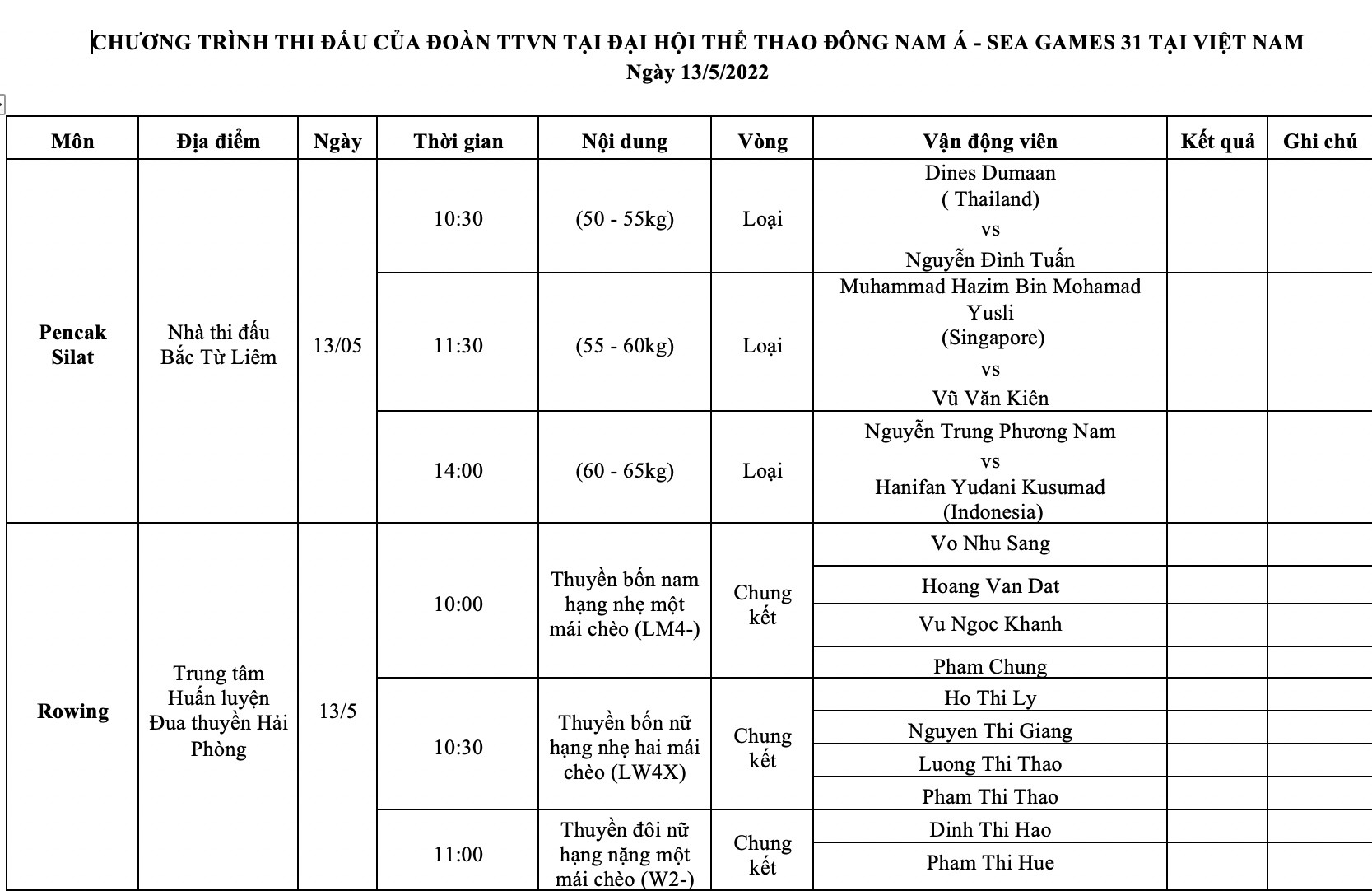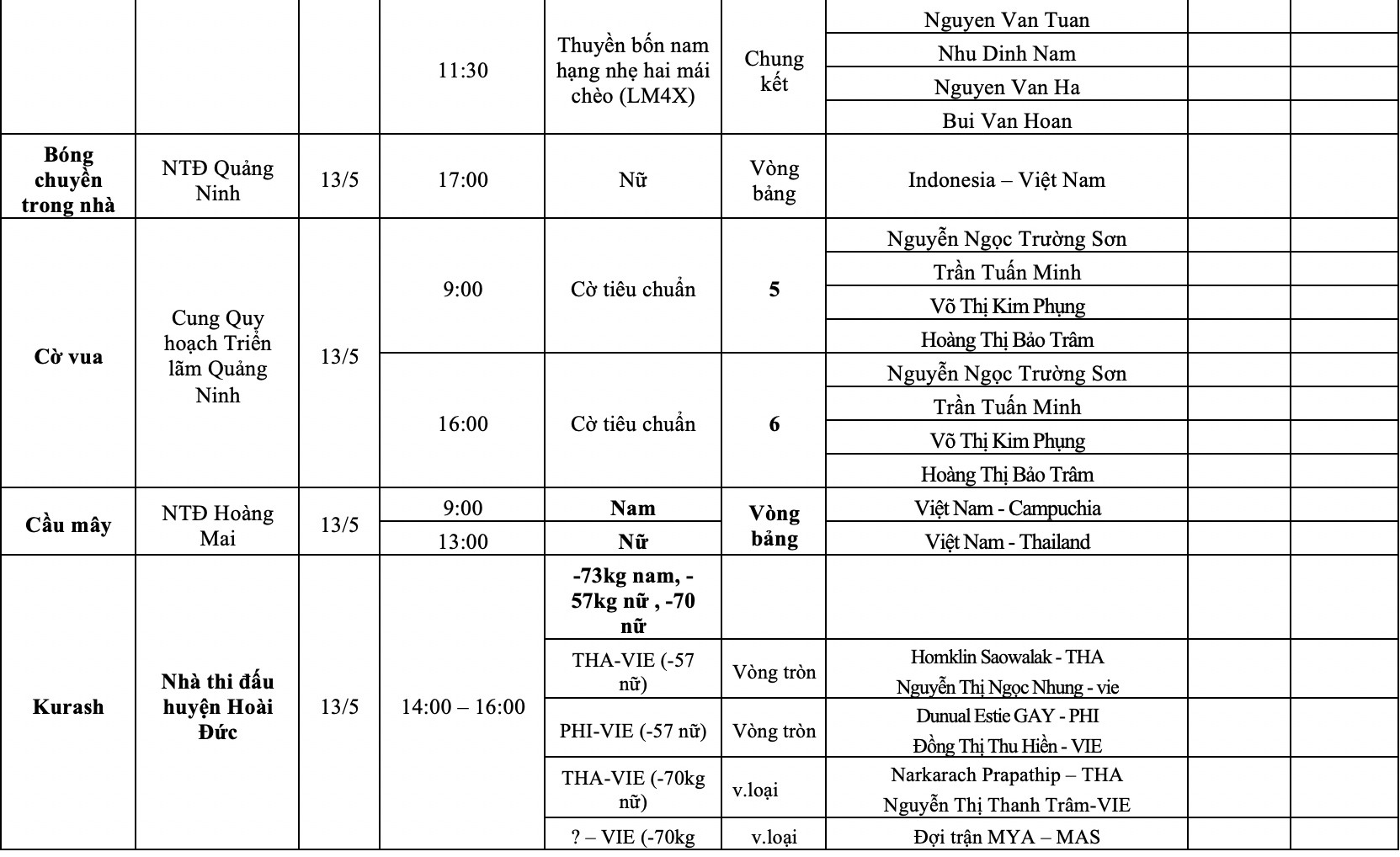 Cũng trong buổi sáng 13/5, rowing có 4 nội dung chung kết, dự kiến có thể mang về ít nhất 1 tấm HCV cho đoàn TTVN. Còn buổi chiều cùng ngày, rất nhiều niềm hy vọng HCV của chủ nhà Việt Nam tranh tài, trong đó đáng chú ý là 3 nội dung chung kết kurash, 3 nội dung chung kết thể hình, 2 nội dung chung kết thể dục dụng cụ.