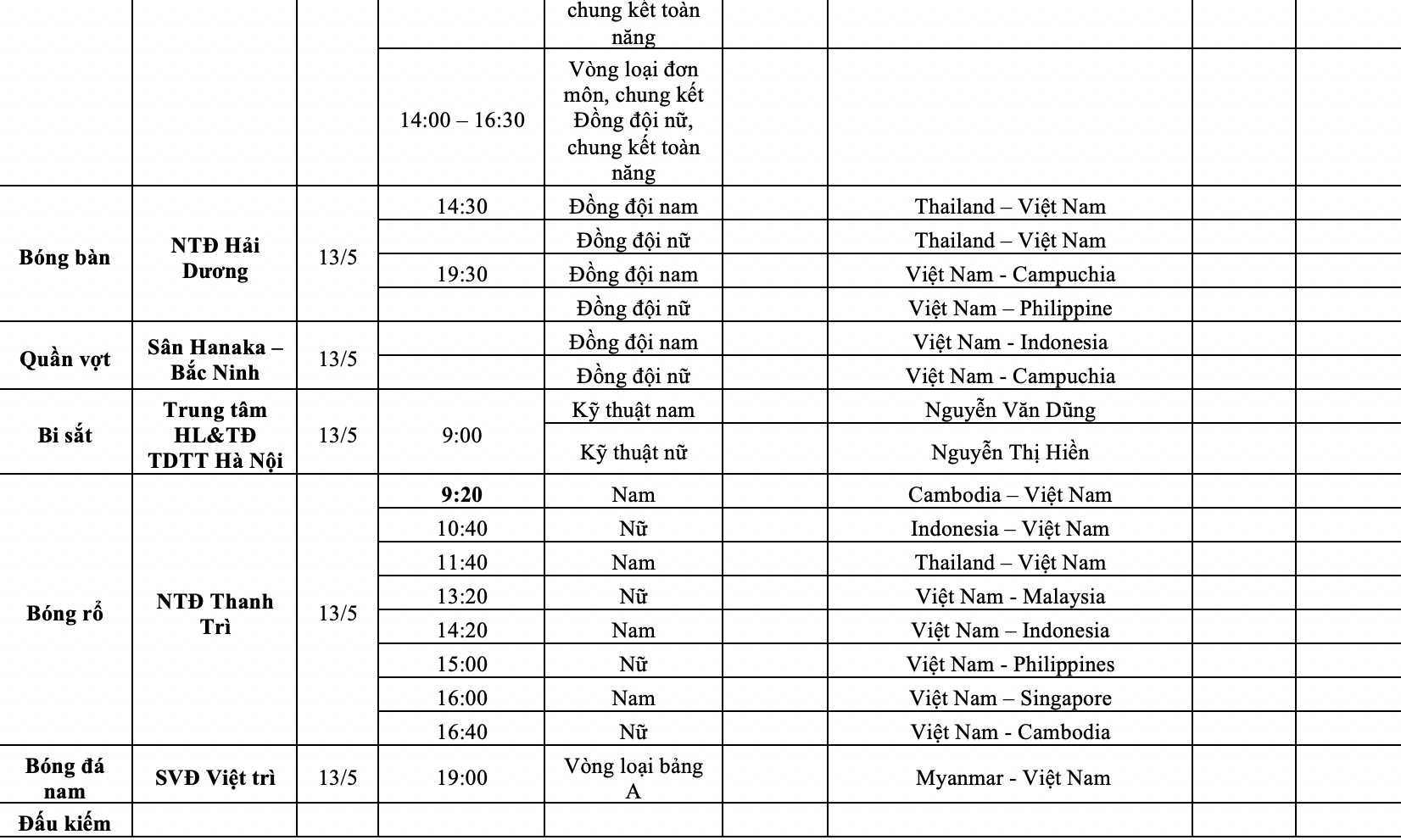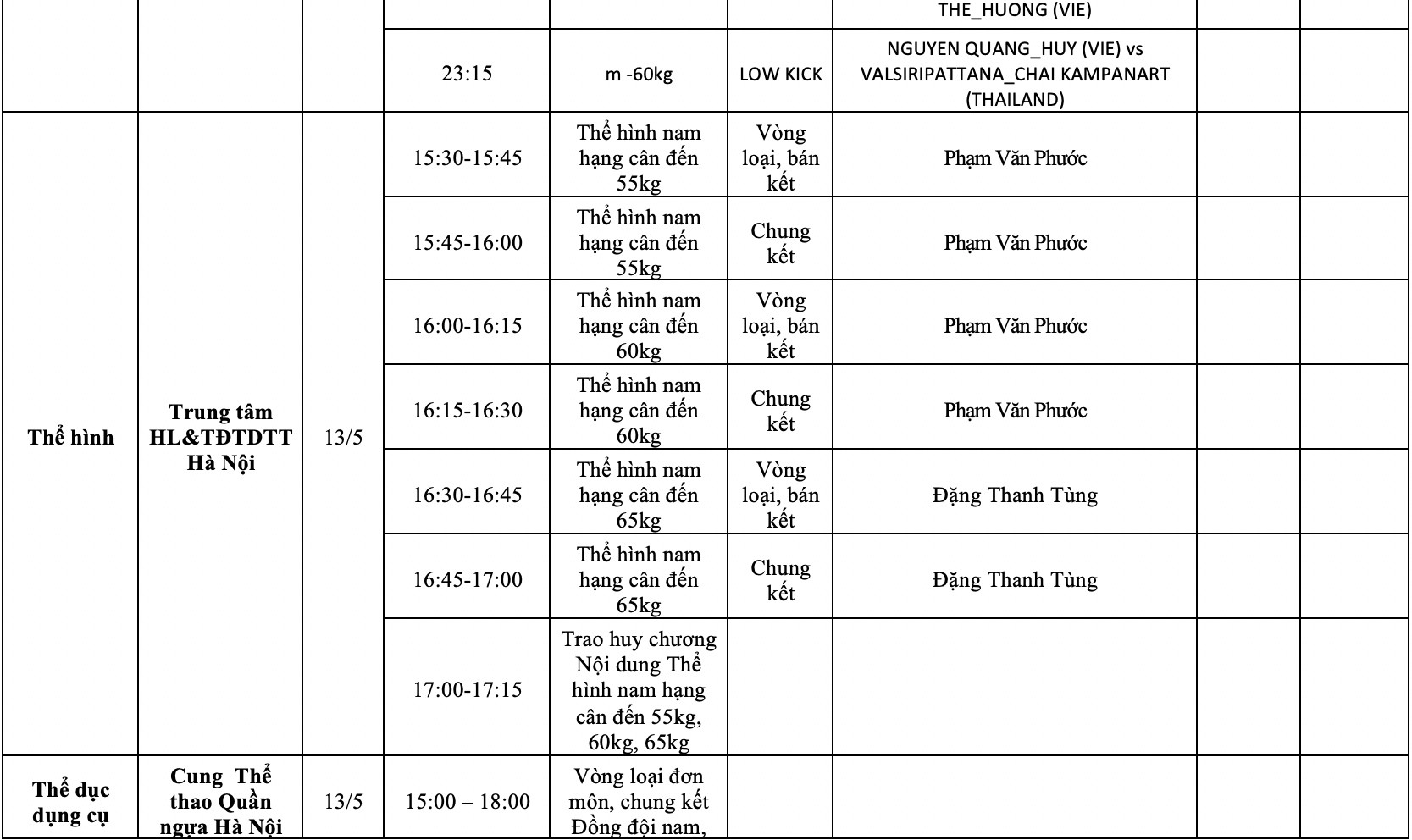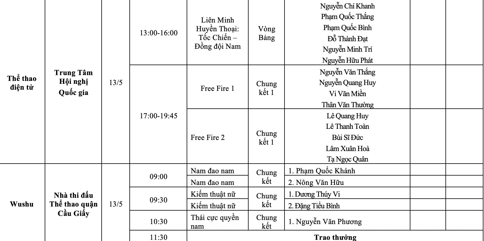 Cũng trong buổi sáng 13/5, rowing có 4 nội dung chung kết, dự kiến có thể mang về ít nhất 1 tấm HCV cho đoàn TTVN. Còn buổi chiều cùng ngày, rất nhiều niềm hy vọng HCV của chủ nhà Việt Nam tranh tài, trong đó đáng chú ý là 3 nội dung chung kết kurash, 3 nội dung chung kết thể hình, 2 nội dung chung kết thể dục dụng cụ.