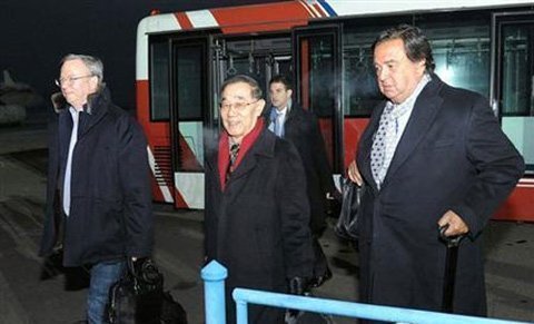 | Ông Eric Schmidt (trái) và ông Bill Richardson (phải) đặt chân xuống sân bay Bình Nhưỡng - Ảnh: Reuters/Kyodo. |