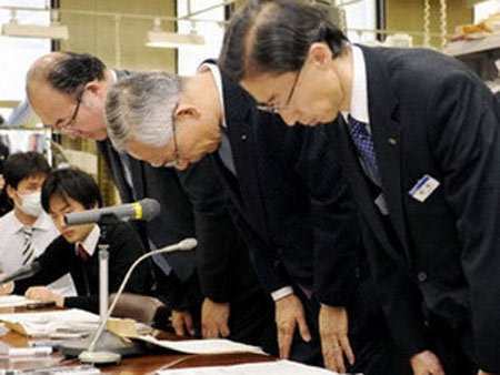 | Chủ tịch Satoru Nishibori (ở giữa) và đại diện các ngân hàng khác cúi đầu xin lỗi về sự cố máy tính, tại trụ sở Ngân hàng Nhật Bản ở Tokyo ngày 18/3. (Nguồn: Kyodo) |
