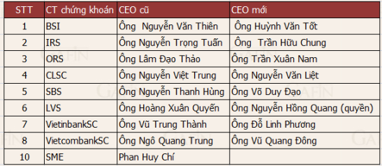 10 công ty chứng khoán và gần 20 ngân hàng thay đổi CEO; hàng chục doanh nghiệp sản xuất khác cũng bổ nhiệm lãnh đạo mới.