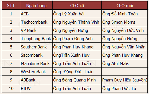 Trong năm nay, có ít nhất 19 ngân hàng thay đổi CEO. Ngoài 10 ngân hàng có tên trong bảng dưới đây còn có 9 ngân hàng khác là SCB, Kienlong Bank, Baoviet Bank, OCB, LienVietPostBank, VietABank, VietCapital Bank, MDB và Ngân hàng Việt Nga cũng thay CEO.