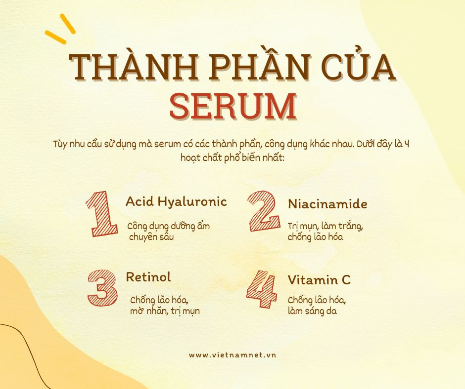 Vì serum có rất nhiều công dụng nên tùy thuộc vào từng sản phẩm, nhà sản xuất sẽ đưa vào serum các thành phần, khoáng chất khác nhau. Dưới đây là những hoạt chất có mức độ phổ biến cao, thường được ứng dụng khi làm serum và an toàn cho làn da: