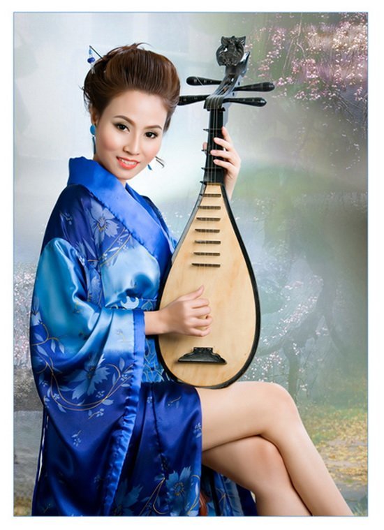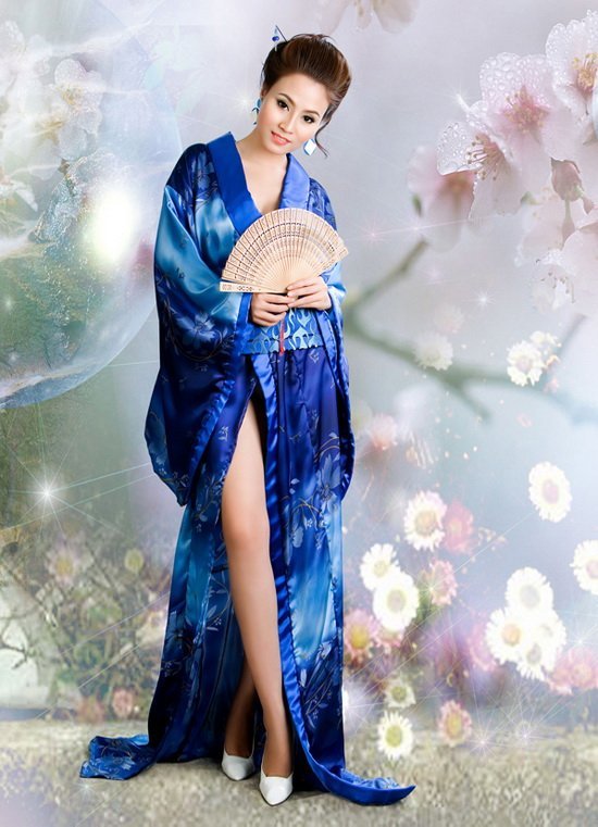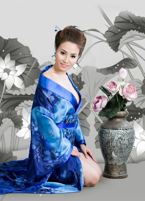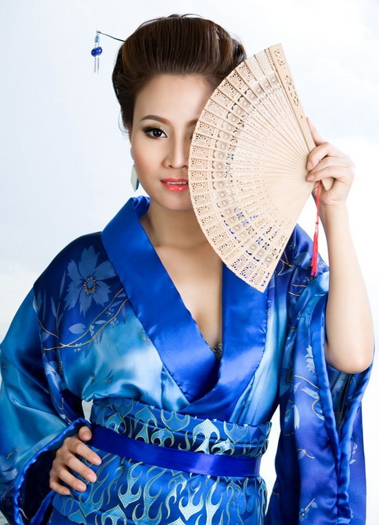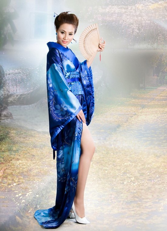 Rất thích áo dài truyền thống, nhưng vì muốn thay đổi hình ảnh mới mẻ, Giang Thanh đã thử "gieo" mình trong bộ áo kimono Nhật Bản. Trong bộ ảnh này, Giang Thanh mang một dáng vẻ khác hẳn với những gì cô từng thể hiện trước đó.