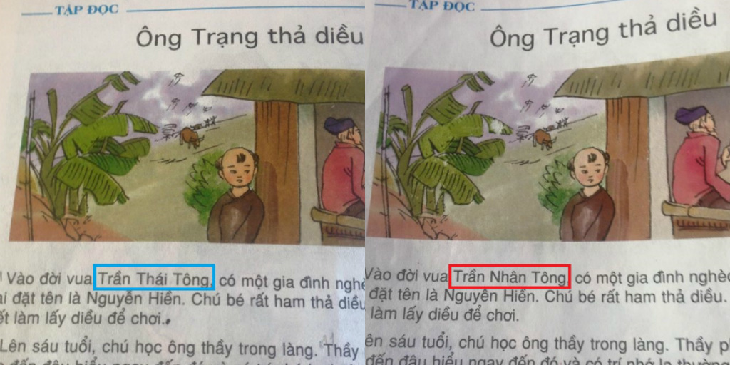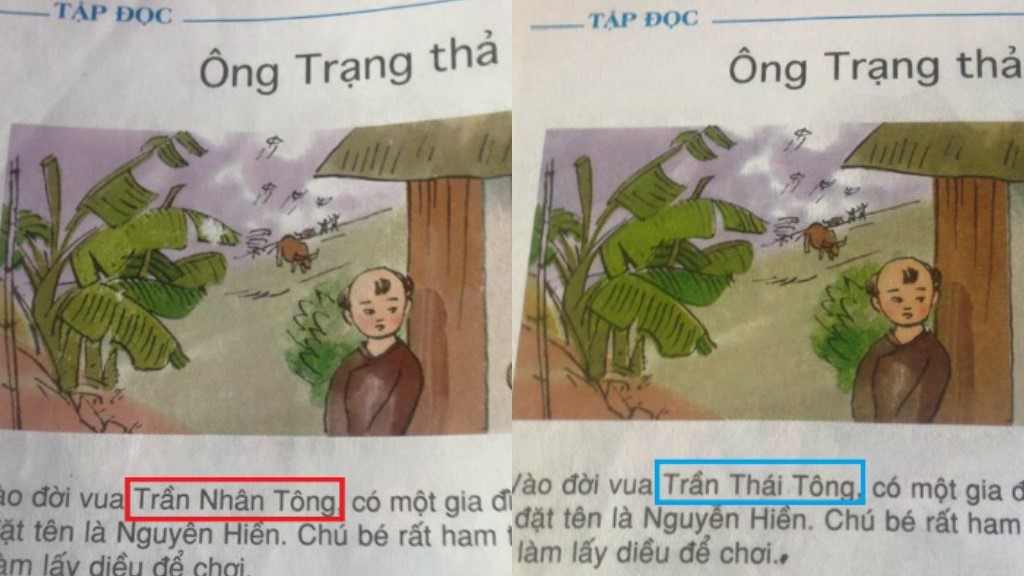 Cụ thể, ở bài Tập đọc “Ông Trạng thả diều” ở tuần thứ 11 trang 104 kể về trạng nguyên Nguyễn Hiền, cùng đều là sách giáo khoa, nhưng có cuốn ghi là đời vua Trần Nhân Tông, cuốn lại ghi đời vua Trần Thái Tông. Sách giáo khoa ghi đời vua Trần Nhân Tông được in vào nộp lưu chiểu vào tháng 4 năm 2005.