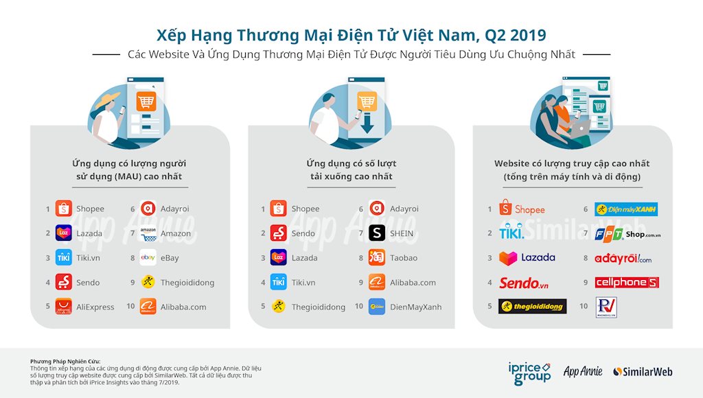 Nghiên cứu của iPrice xếp hạng các ứng dụng TMĐT theo hai tiêu chí được đo theo công nghệ của App Annie: tổng số lượt tải về của ứng dụng và số lượng người sử dụng trung bình hàng tháng của các ứng dụng (Monthly Active Users - MAU). Nếu như con số lượt tải về cho thấy ứng dụng nào đang thành công nhất về mặt thu hút người sử dụng mới thì số MAU lại giúp chỉ ra những ứng dụng đang làm tốt việc giữ chân khách hàng và khiến họ thường xuyên tương tác.