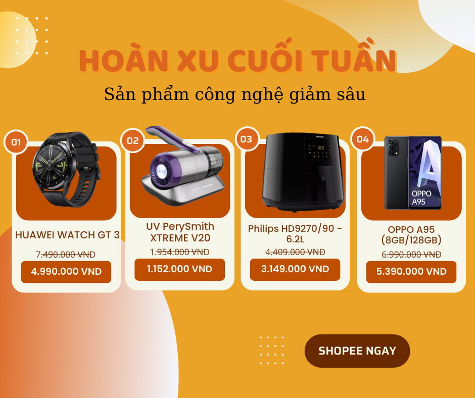 Người dùng Shopee dành ngày cuối tuần để săn loạt deal chính hãng giảm sâu trên toàn ngành hàng. Đặc biệt, các sản phẩm điện tử gia dụng, sản phẩm công nghệ đang “gây bão” với mức giá hấp dẫn trong chương trình “Hoàn xu cuối tuần” đang diễn ra trên Shopee.