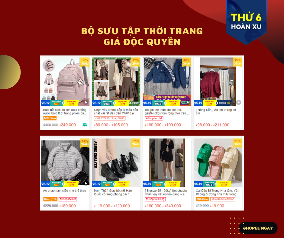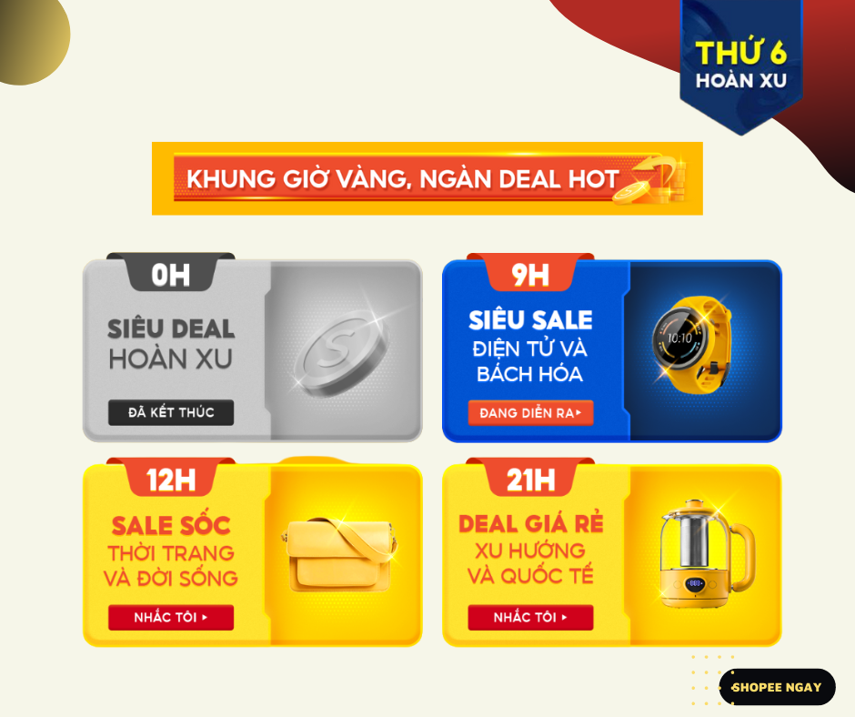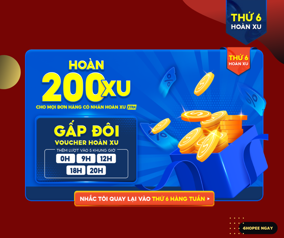 Khám phá loạt sản phẩm giảm giá sâu cùng ưu đãi hoàn Xu và miễn phí vận chuyển trong chương trình Thứ 6 - Siêu sale hoàn xu của Shopee: https://shopee.vn/m/thu-6-hoan-xu