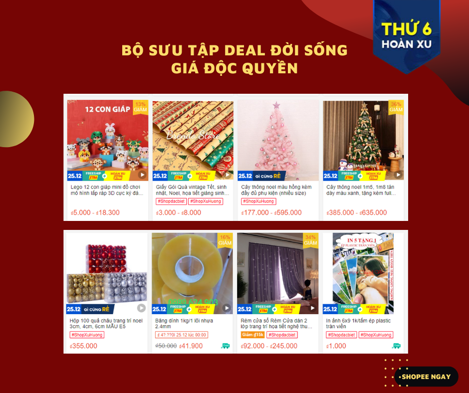 Trước thềm Giáng Sinh, Shopee sẽ mang đến người dùng hàng ngàn sản phẩm giảm giá sâu đáp ứng nhu cầu mua sắm tăng cao mùa lễ hội. Khách hàng có thể tận dụng cơ hội này để sắm thêm đồ trang trí nhà cửa, quà tặng bạn bè hoặc thay đổi tủ quần áo mùa đông bằng các sản phẩm chất lượng với mức giá hấp dẫn nhờ ưu đãi từ Shopee.