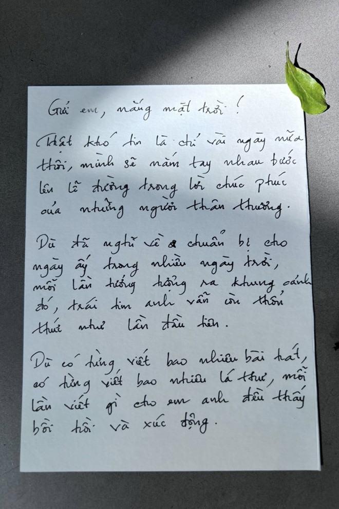 Sau khi phát hành ca khúc, Kai Đinh viết tâm thư đầy cảm động gửi vợ sắp cưới: "Gửi em, nắng mặt trời... Cảm ơn em đến và cho anh hiểu sâu sắc thế nào yêu một người và thế nào được yêu. Cho anh biết, anh không cần phải hy sinh bất cứ điều gì chỉ để được yêu".