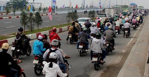 | Do ùn tắc kéo dài trên trục xa lộ Hà Nội trong khi nhánh giữa cầu Rạch Chiếc mới chưa thông xe, nhiều ô tô đã tiếp tục đi vào nhánh biên bên cầu đáng lẽ dành cho xe máy |
