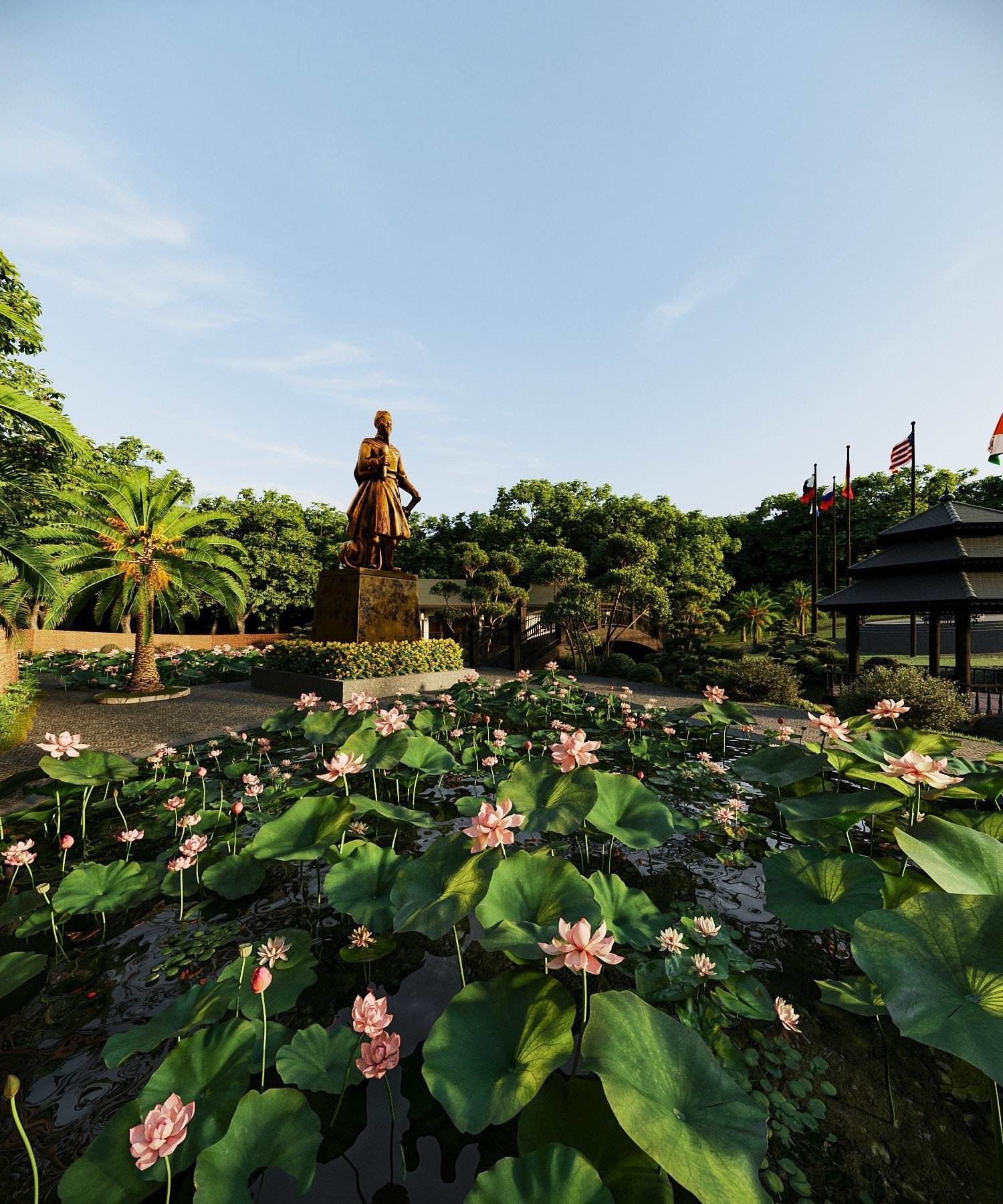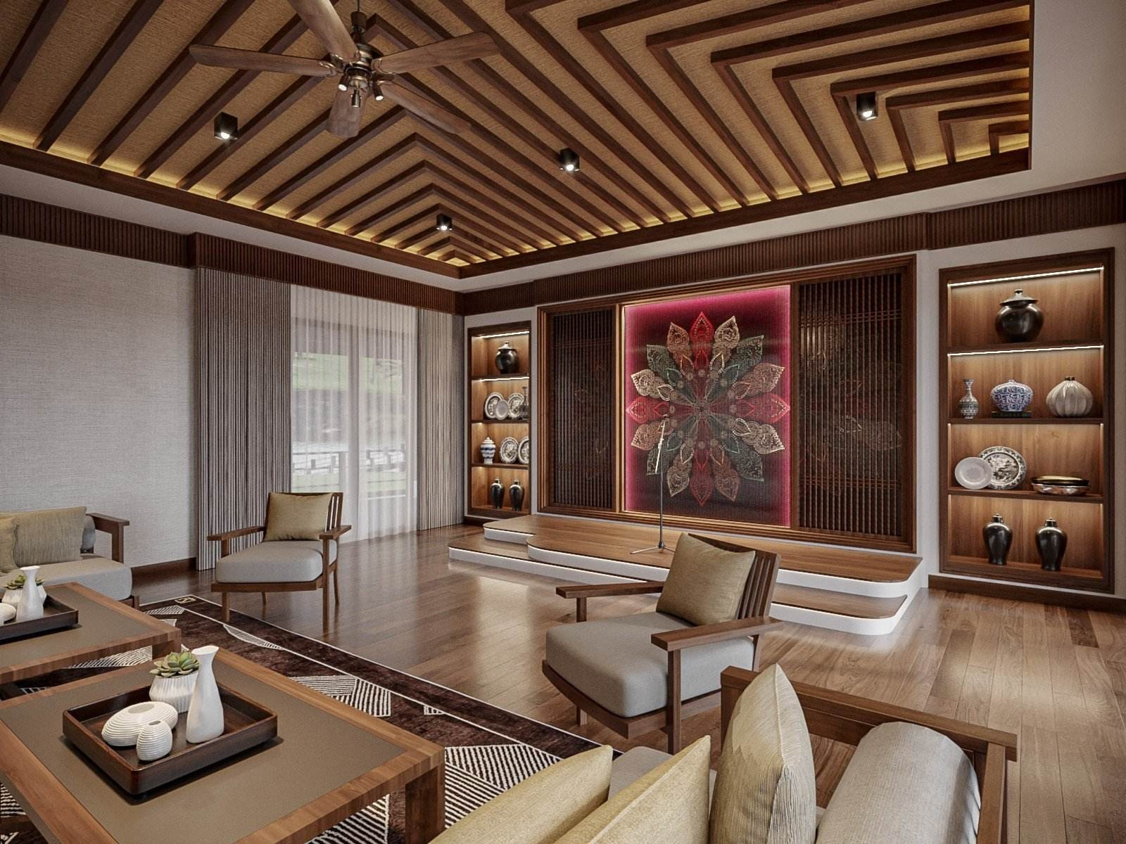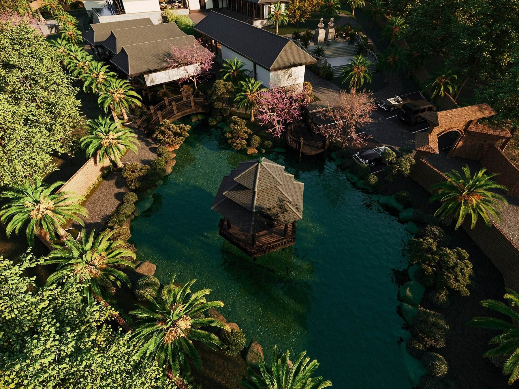 Hồ nước phong thủy trước nhà có tác dụng điều hòa không khí, mang ý nghĩa phong thủy và tạo cảnh quan đẹp mắt. Lầu lục giác giữa hồ phục vụ những bữa trà chiều mang phong cách hoài cổ.