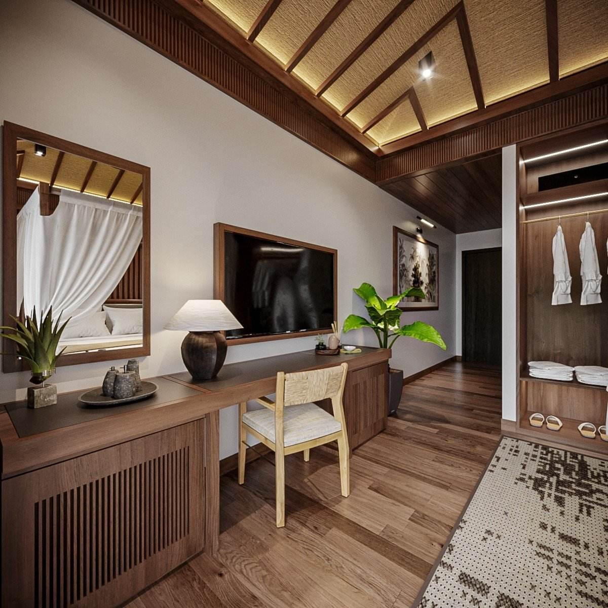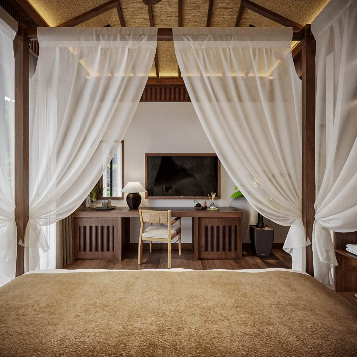 Phòng ngủ sang trọng, tinh tế. Một bên tiếp giáp với thiên nhiên được dùng kính lớn để mở rộng tầm nhìn, đón trọn ánh sáng vào nhà.