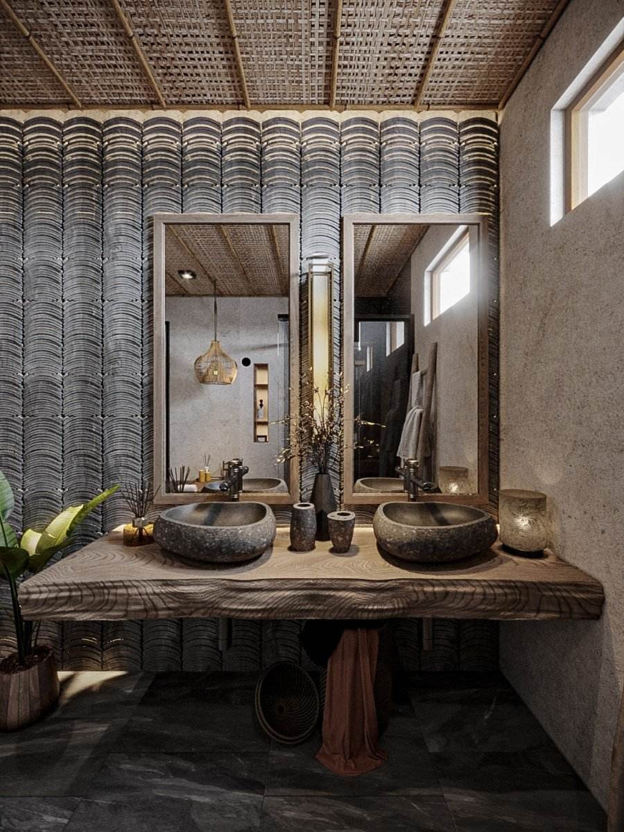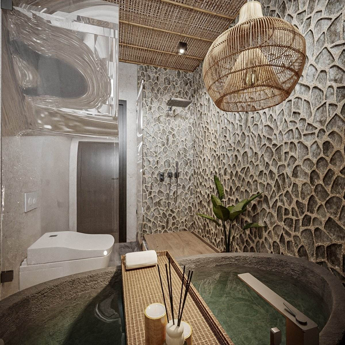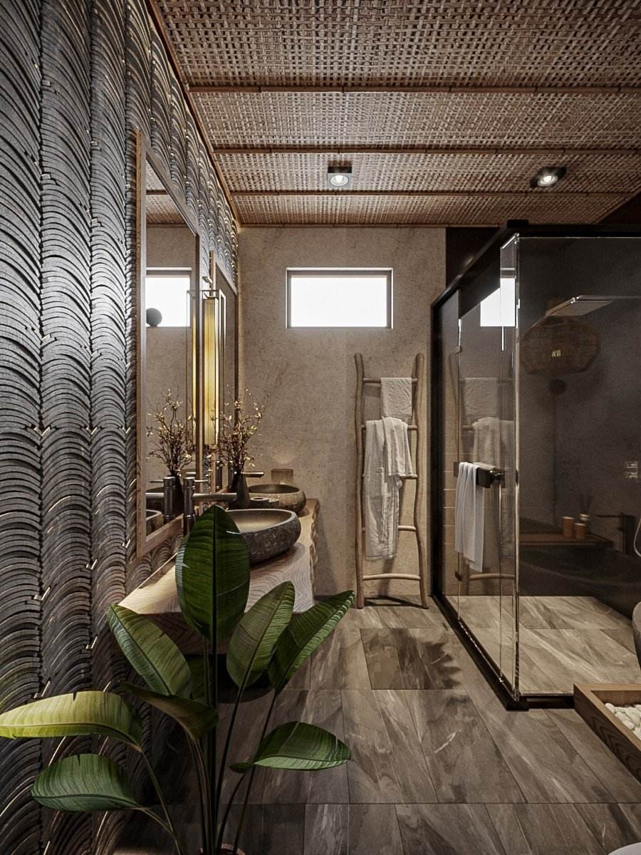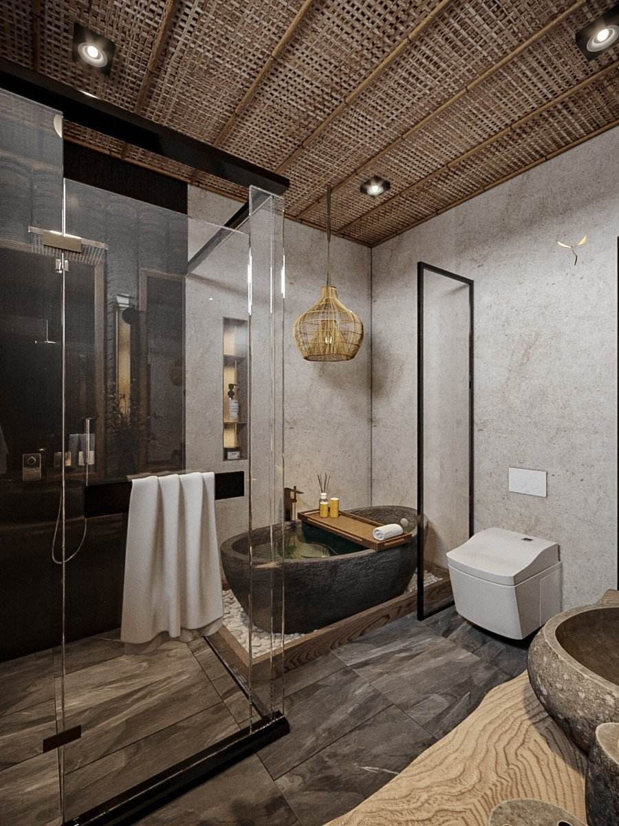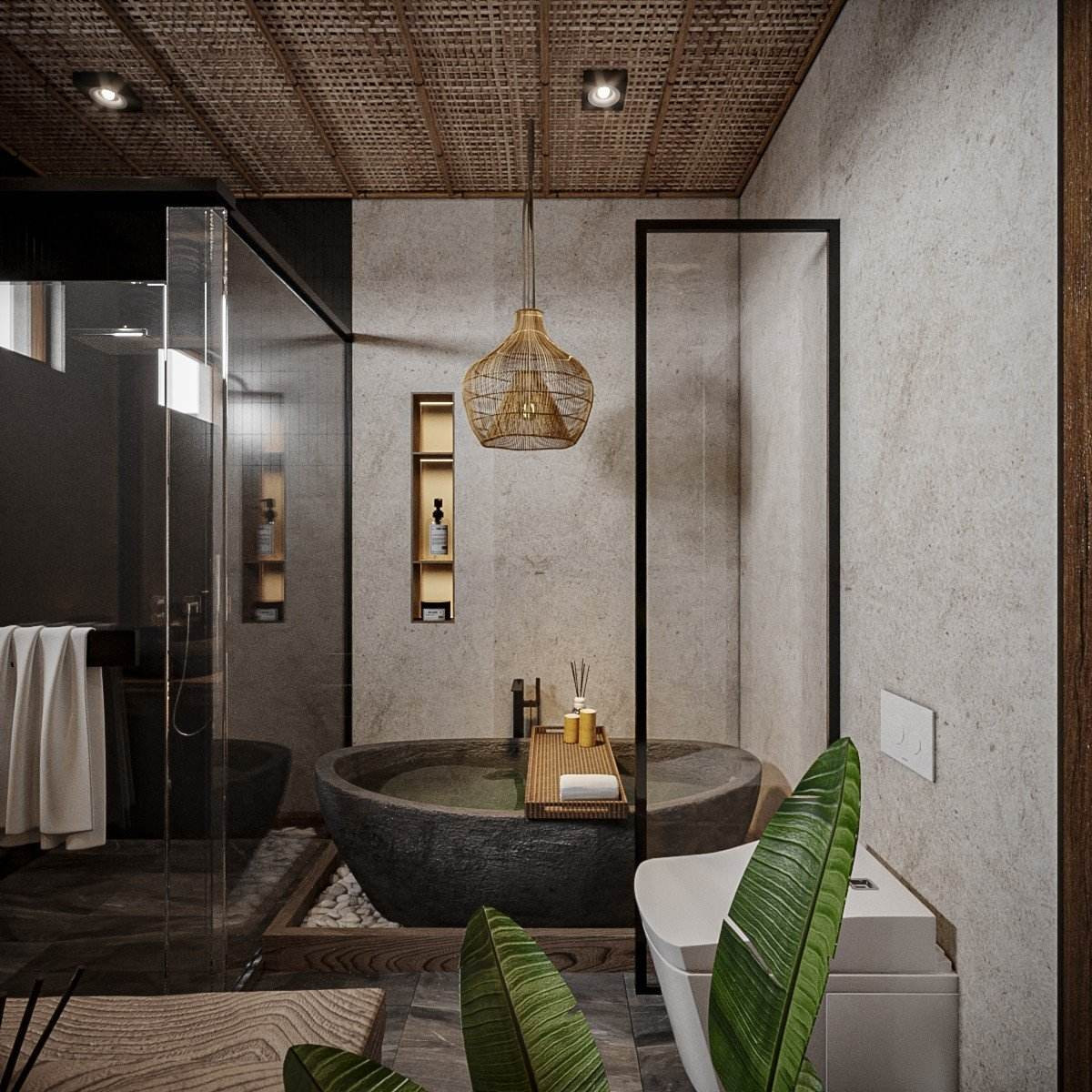 Một ngôi nhà "chữa lành" với không gian nghỉ dưỡng chắc chắn không thể thiếu phòng tắm thư giãn với chiếc bồn tắm bê-tông dẻo.