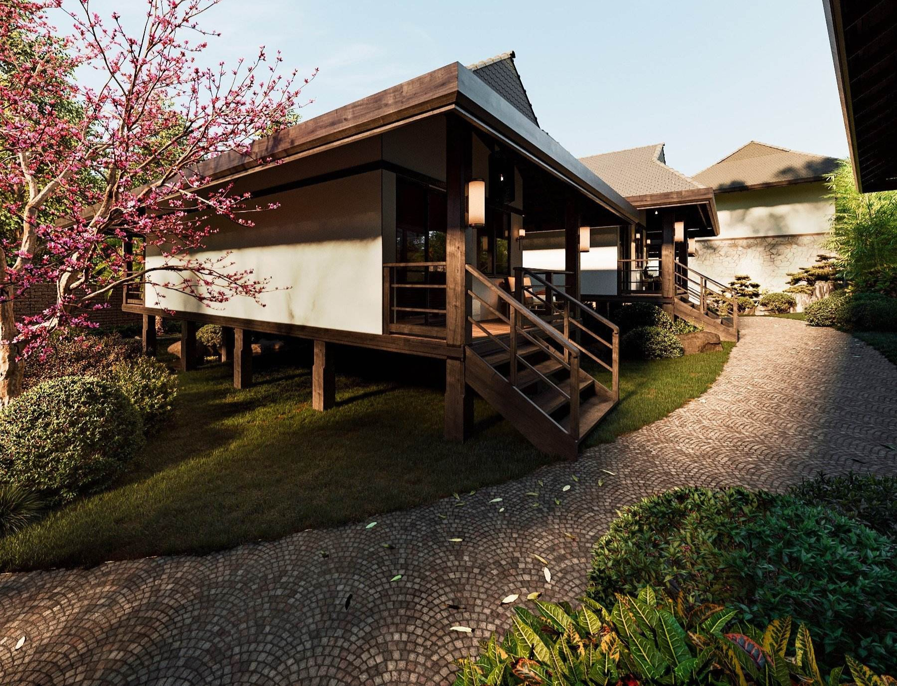 Những nếp nhà mái dốc phục vụ cho các nhu cầu chức năng khác nhau của gia đình. Lối dẫn vào các khu vực chức năng lát đá nhỏ, có khe nhám để dễ thoát nước và tránh trơn trượt.