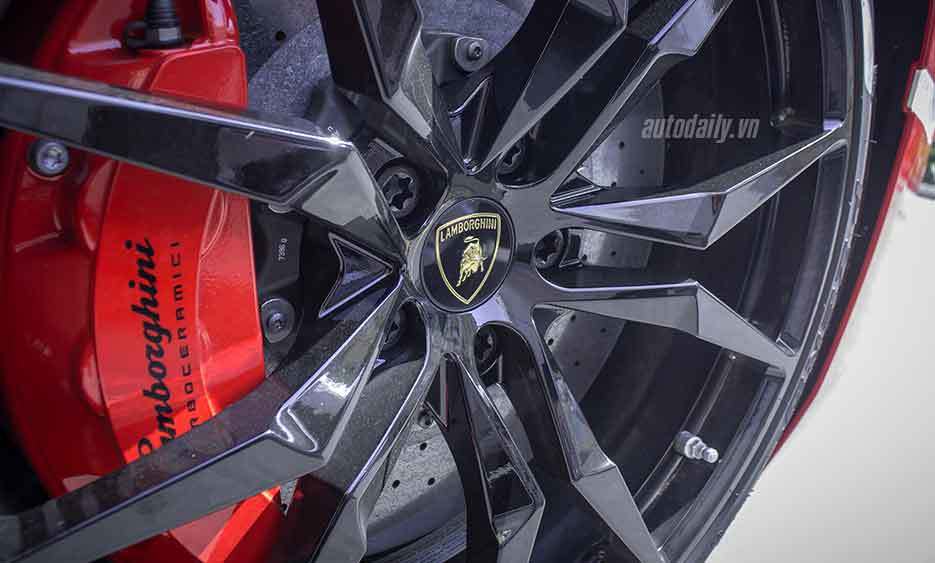 Chiếc Aventador Roadster độc nhất Việt Nam thời điểm hiện tại sở hữu màu sơn đỏ, cùng màu với hệ thống heo phanh. Kết hợp với chúng là bộ mâm sơn đen bóng, kích thước 19 inch phía trước và phía sau là 20 inch. Đi kèm với đó là bộ lốp hiệu suất cao của Pirelli kích thước 255/35 ZR trước và 335/30 ZR sau.
