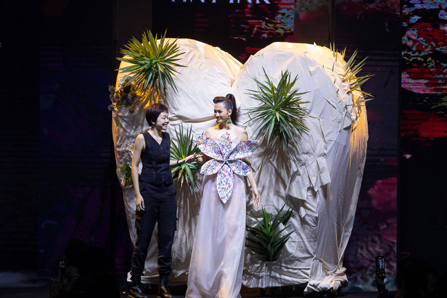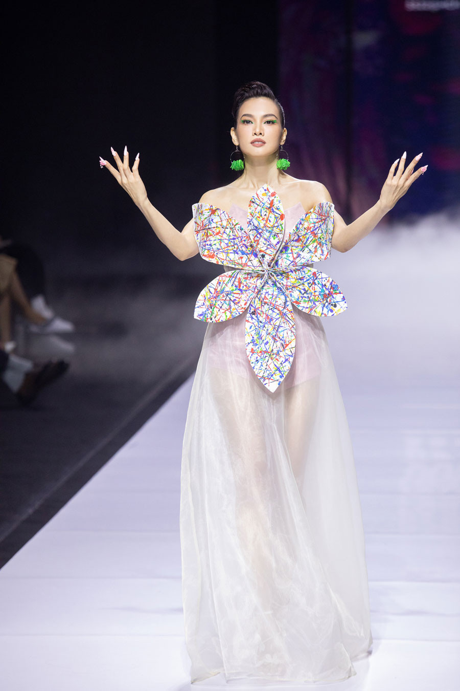NTK Hoàng Quyên vừa ra mắt BST “Hidden Gem” trong khuôn khổ Tuần lễ thời trang Quốc Tế Việt Nam mùa xuân hè 2022. Cô trao vị trí quan trọng nhất - vedette của show diễn cho siêu mẫu Anh Thư.Trước khi Anh Thư ra sân khấu, chiếc váy của cô bị hỏng phần khóa kéo. NTK Hoàng Quyên phải lập tức khâu cố định phần sau của váy.Vì được xử lý gấp rút, chiếc váy khó vừa vặn hoàn toàn cơ thể của Anh Thư. Người đẹp cho biết thiết kế rộng nên bị tuột, dài hơn so với lúc cô thử đồ.Khi bước lên sàn diễn, mỹ nhân 40 tuổi gặp đôi chút khó khăn.Ban đầu, cô phải kéo nhẹ váy để tránh dẫm lên phần tà trước. Tuy nhiên sau đó, cô khắc phục được nhờ đổi cách catwalk. Người đẹp tự tin trong vai trò vedette và diễn 'phiêu' hơn để tôn vinh trang phục.Với thông điệp #ReFashion của tuần lễ thời trang năm nay, NTK Hoàng Quyên mong muốn gửi gắm câu chuyện ý nghĩa: Ẩn giấu dưới lớp đất khô cằn là “tầng tầng lớp lớp” đá quý đang tỏa sáng rực rỡ, sự tỏa sáng ấy được kết tinh và chắt lọc từ rất rất nhiều lần chuyển hoá. Và đó cũng chính là điều mà siêu mẫu Anh Thư thể hiện trong vị trí vedette lần này.Có lẽ, NTK Hoàng Quyên đã có ý đồ khi lựa chọn siêu mẫu Anh Thư trở thành nàng thơ trong BST, khi cô được hoá thân thành đoá hoa bước ra từ viên ngọc sáng. Cũng giống như sự trở lại lần này của siêu mẫu Anh Thư với thời trang và nghệ thuật.