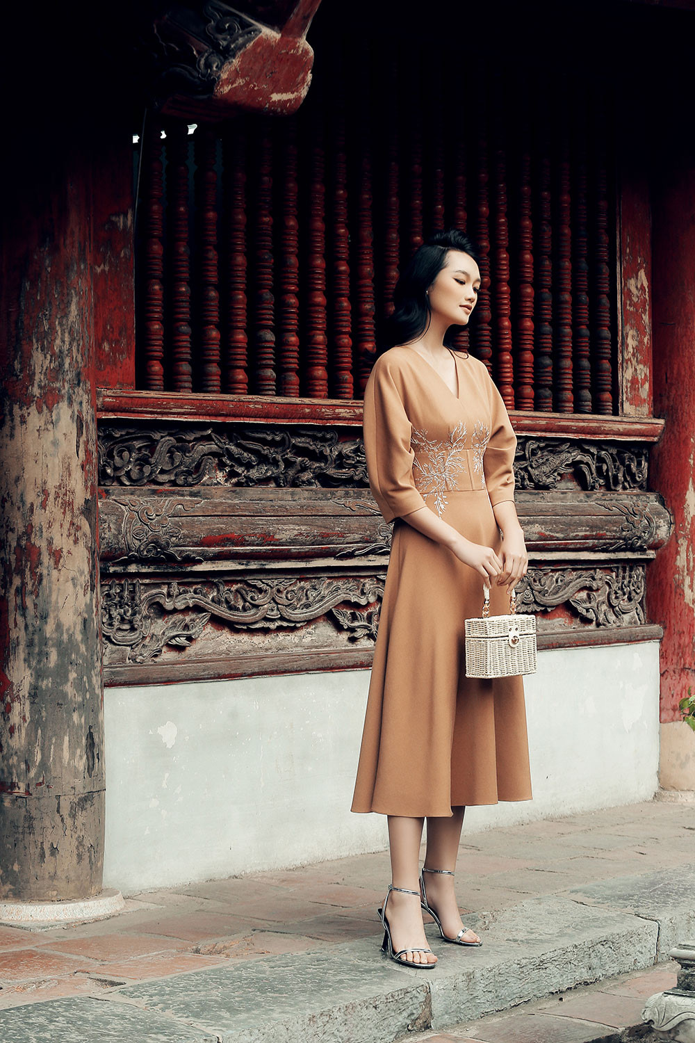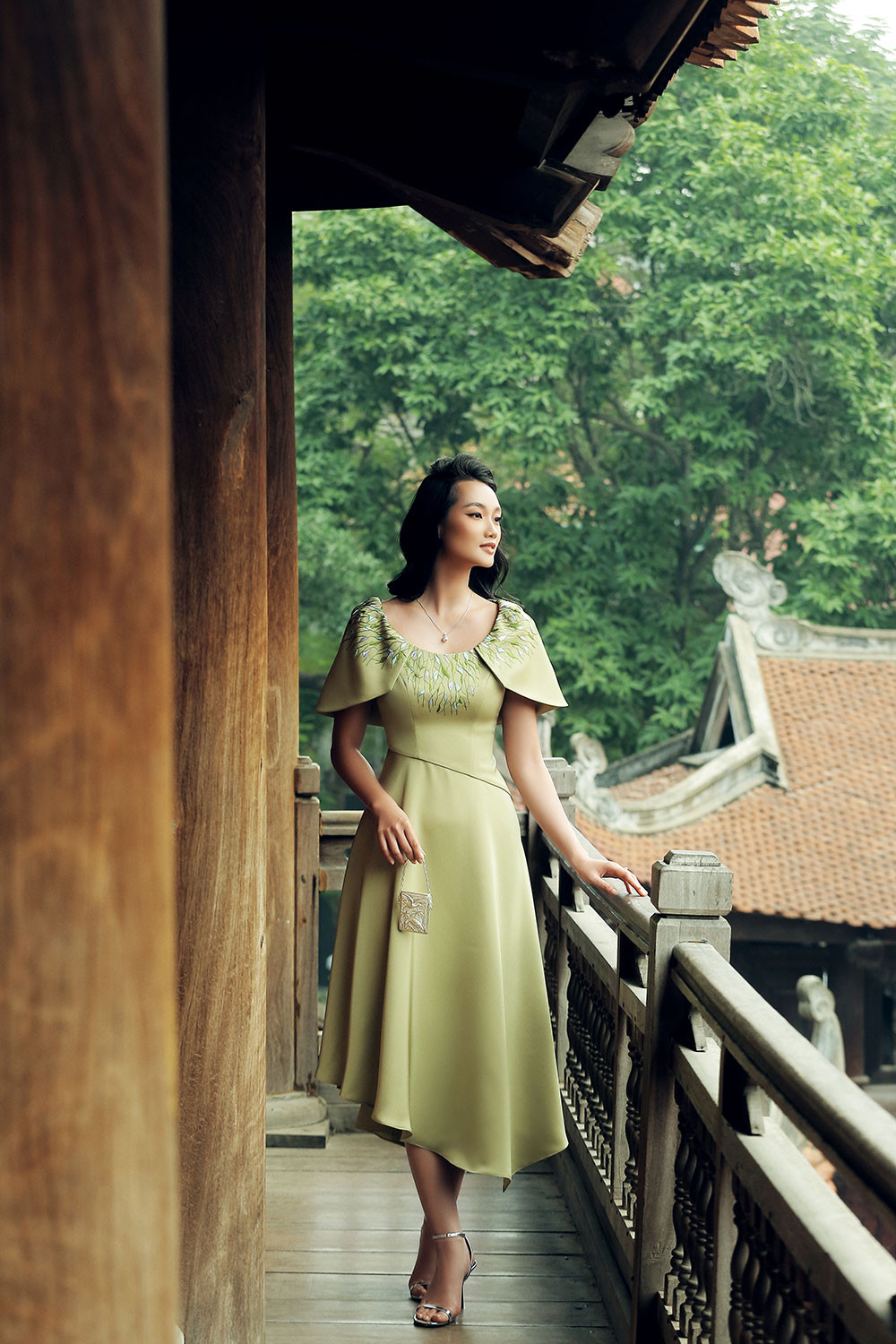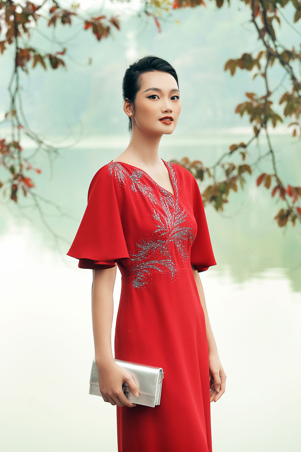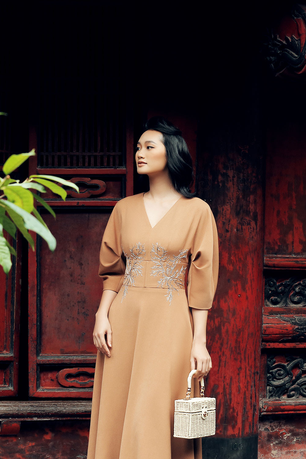 Trên nền chất liệu cao cấp như lụa satin tơ tằm, tafta, cotton lụa, NTK chú trọng vào từng đường cắt, đường may để mỗi thiết kế có phom chuẩn, tôn vóc dáng và vẻ sang trọng cho người mặc. Điểm nhấn tinh tế trên mỗi thiết kế là chi tiết thêu tay những chiếc lá, khiến trang phục trở nên bay bổng, lãng mạn như chính những lần thời tiết Hà Nội chuyển mùa.
