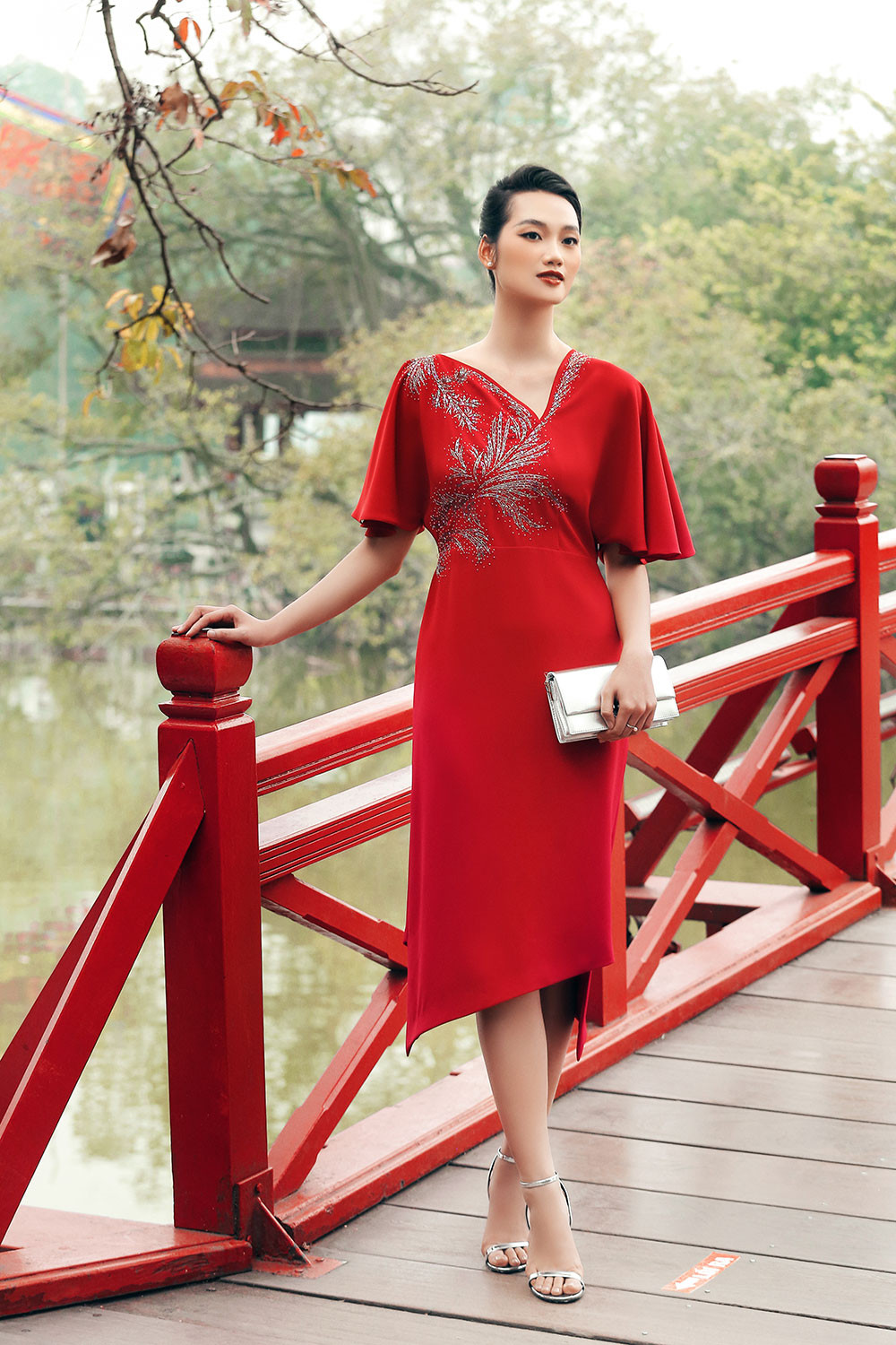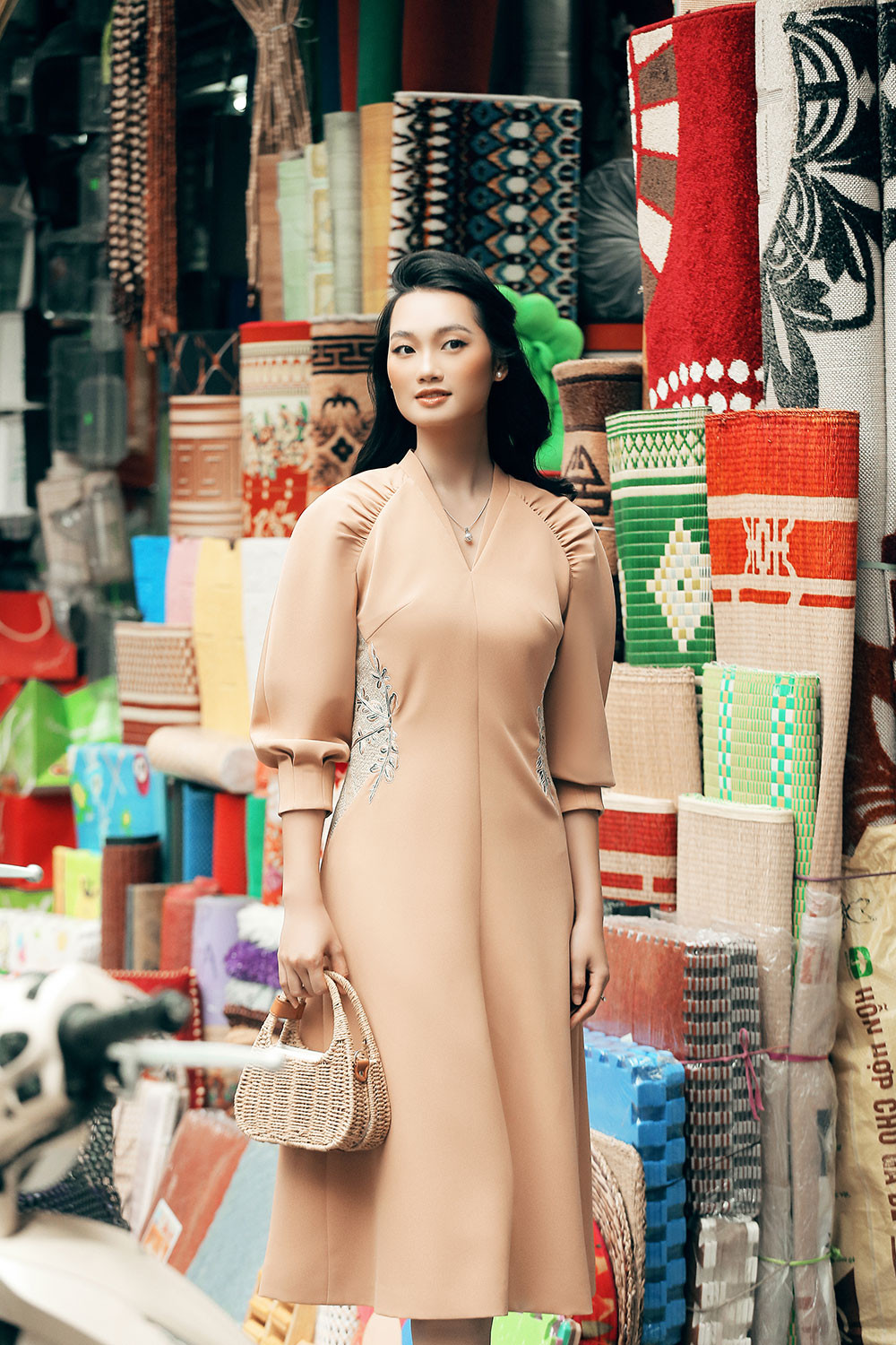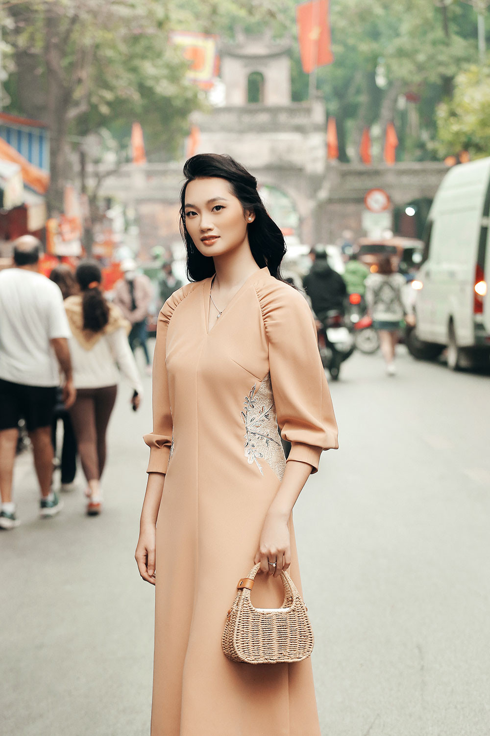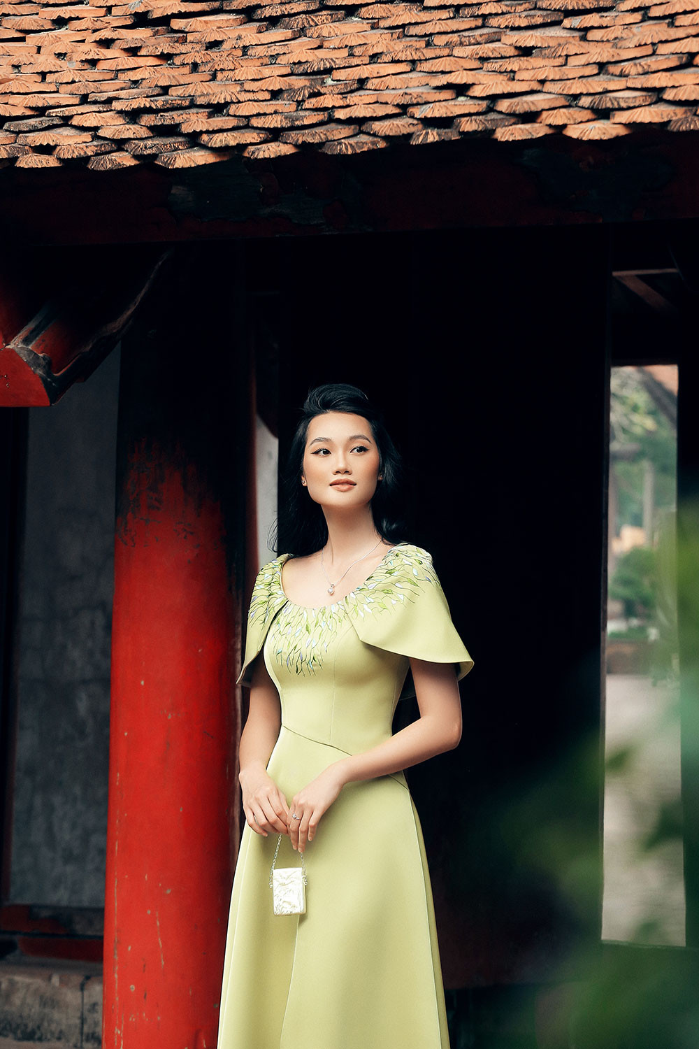 Trên nền chất liệu cao cấp như lụa satin tơ tằm, tafta, cotton lụa, NTK chú trọng vào từng đường cắt, đường may để mỗi thiết kế có phom chuẩn, tôn vóc dáng và vẻ sang trọng cho người mặc. Điểm nhấn tinh tế trên mỗi thiết kế là chi tiết thêu tay những chiếc lá, khiến trang phục trở nên bay bổng, lãng mạn như chính những lần thời tiết Hà Nội chuyển mùa.