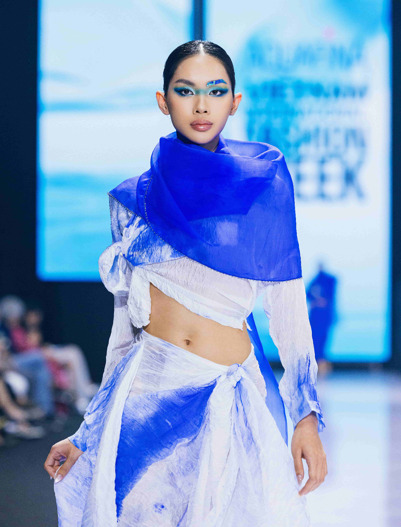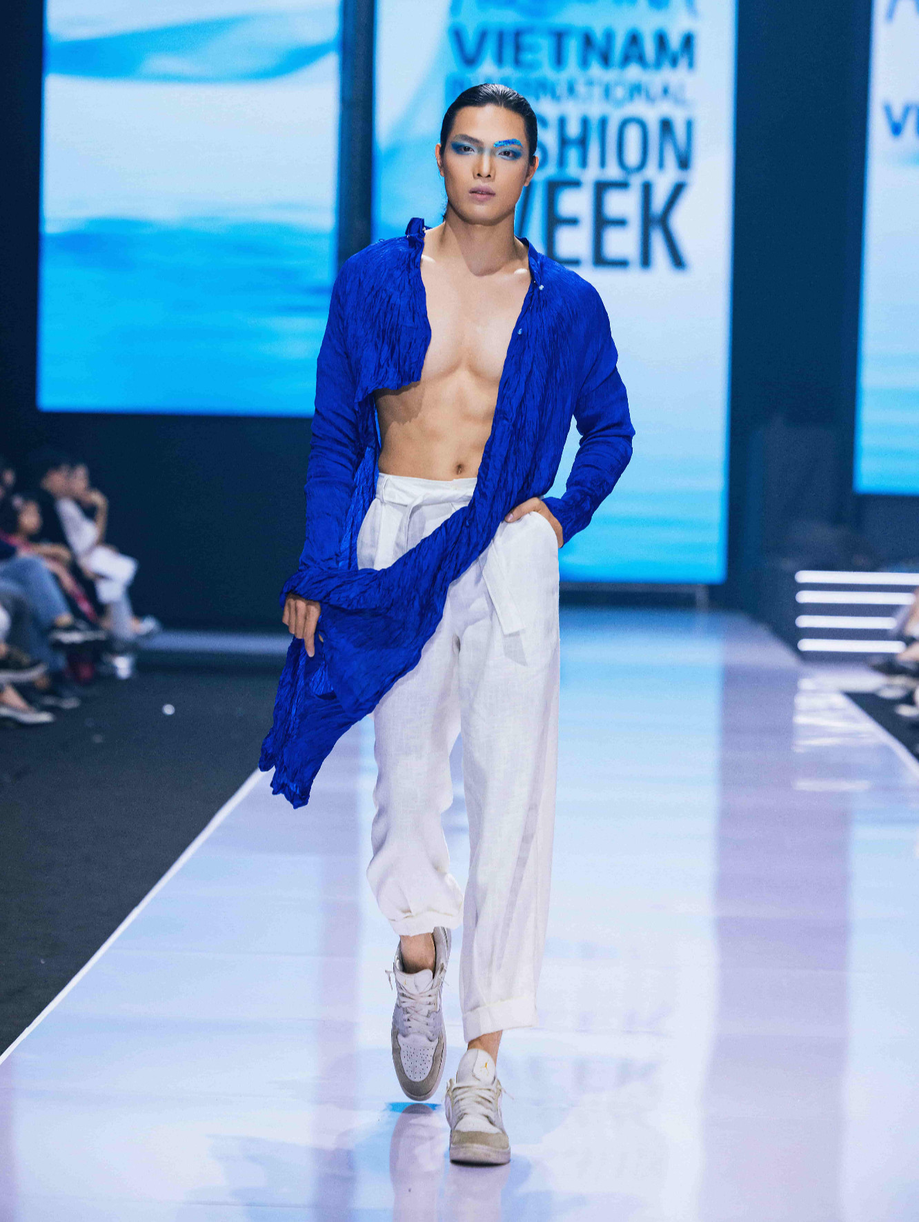 Đêm diễn thời trang quy tụ một số người mẫu như: Minh Toại, Mạc Trung Kiên, Huỳnh Tú Anh... Nhà thiết kế Vũ Việt Hà biến hoá trang phục bằng chiếc bình xịt màu thủ công. Trên nền lụa trắng, váy áo hiện lên những mảng màu xanh ngẫu hứng. Kỹ thuật này là một khâu trong công đoạn nhuộm vải của "Sóng tơ". Hiệu ứng loang màu trên vải tạo sự lan tỏa, chuyển động của tông màu từ đậm sang nhạt tự nhiên, bắt mắt.