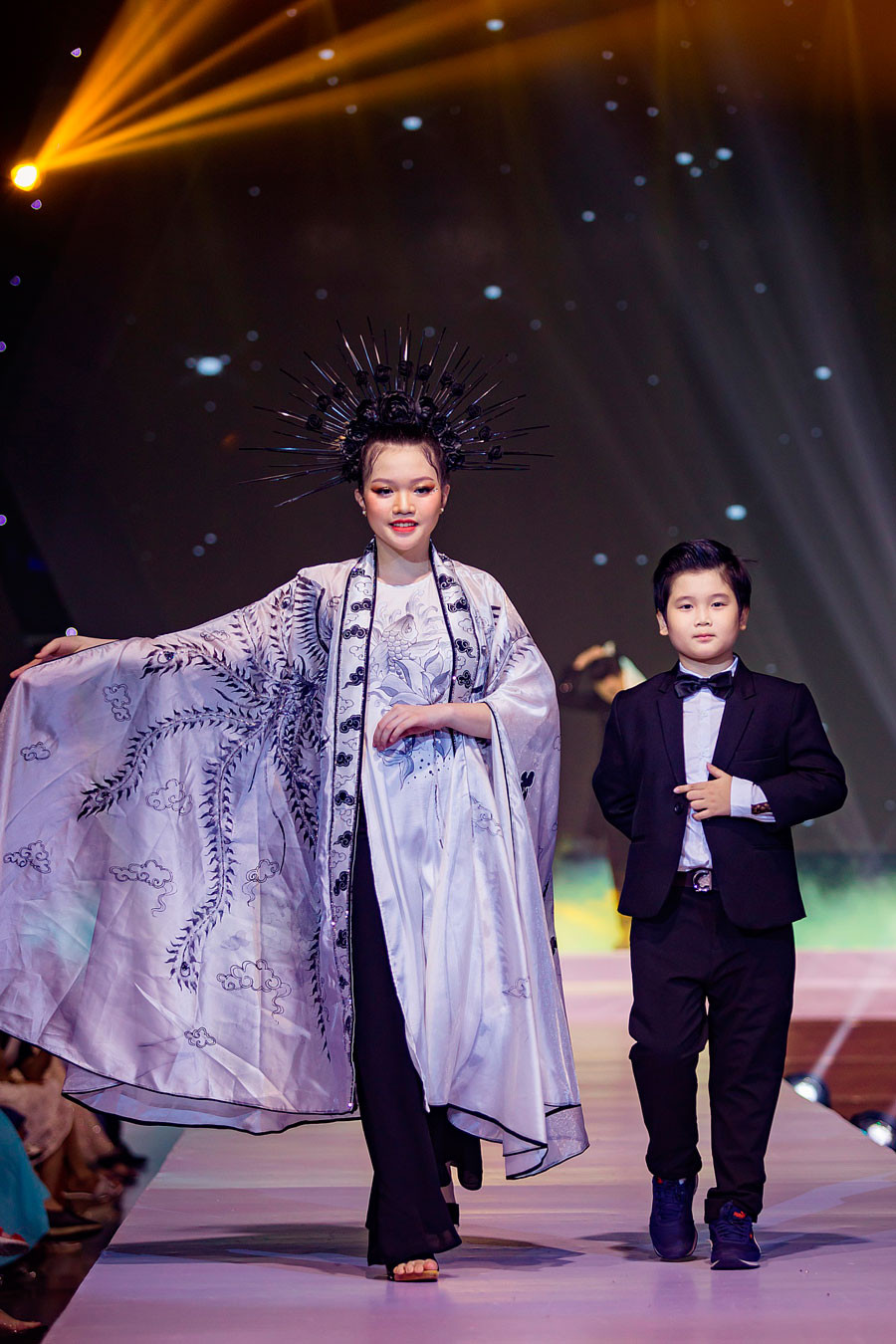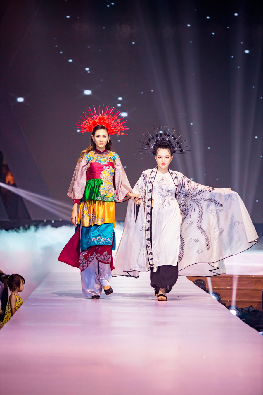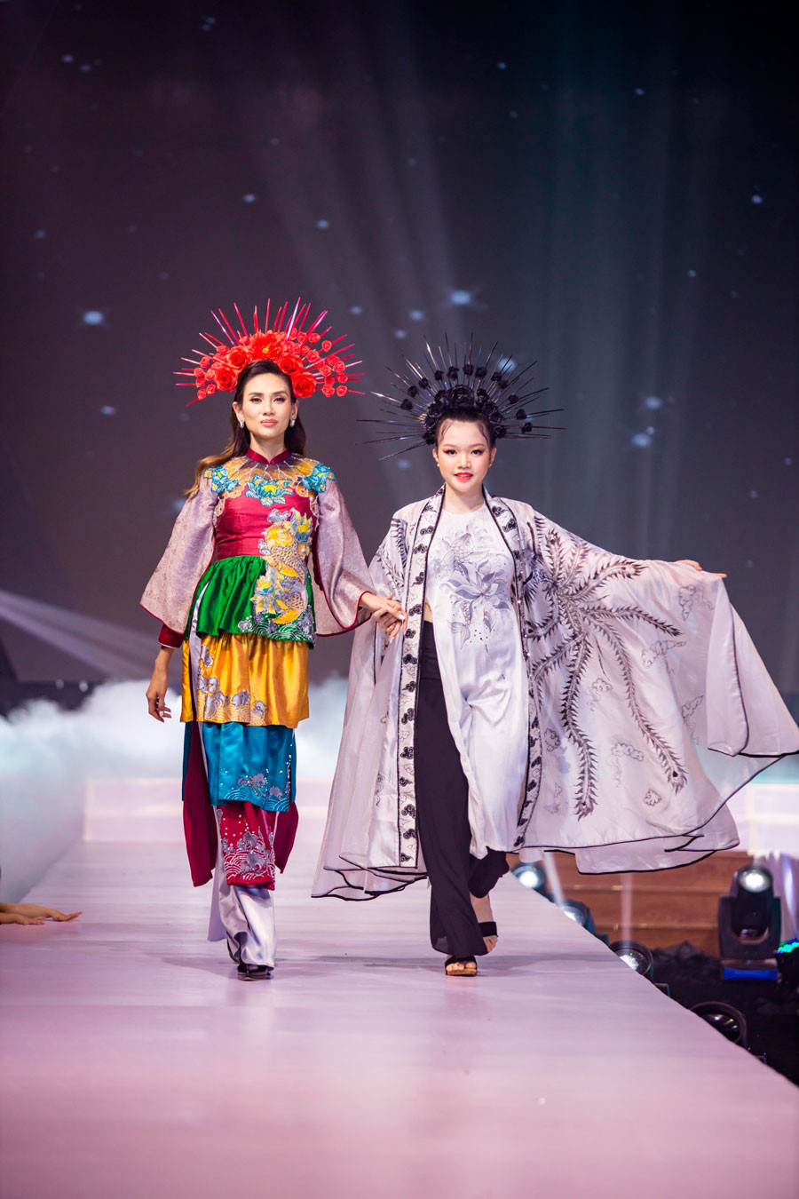 Siêu mẫu Võ Hoàng Yến đã chứng tỏ sức nóng của mình qua màn vedette "thần sầu" với mẫu nhí Nguyễn Gia Linh trong trang phục áo dài của NTK Châu Loan.