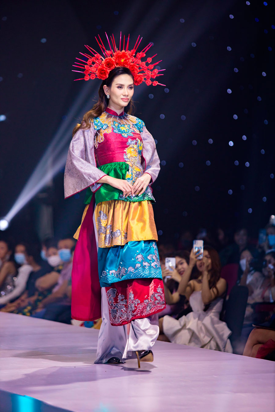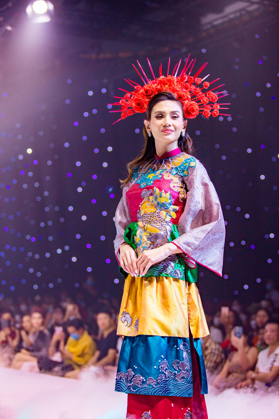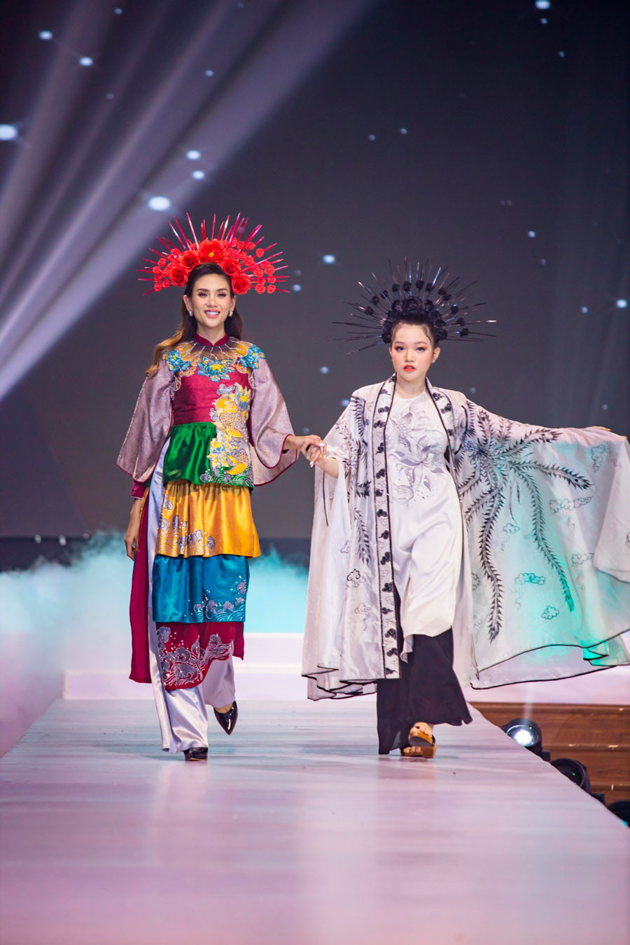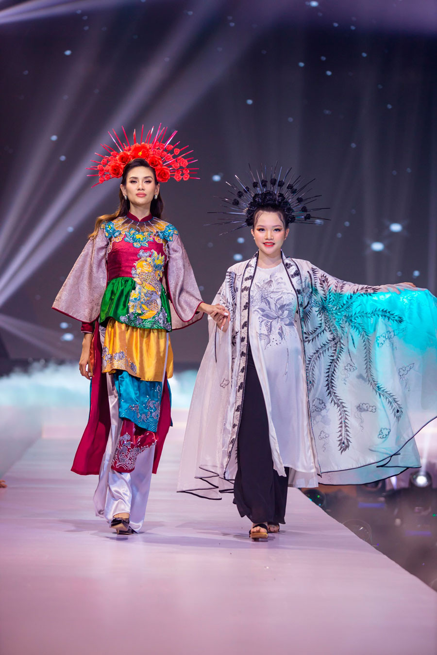 Show diễn Thiên đường giấc mơ 2 do NTK Phạm Thị Châu Loan tổ chức với mong muốn bảo tồn, ứng dụng và phát huy tà áo dài Việt Nam. Tham gia vào show diễn lần này, Á hậu, Siêu mẫu Võ Hoàng Yến đảm nhận vai trò vedette cho BST Cổ Linh của NTK Châu Loan.Khoác trên mình bộ áo dài được lấy cảm hứng văn hoá tín ngưỡng tâm linh của dân gian. Thiết kế cách tân với những tầng áo xếp chồng lên nhau tạo sự khác biệt cho bộ trang phục. Hoa văn trên bộ áo dài được đính kết tỉ mỉ bằng tay với biểu tượng là những con vật linh thiêng được dân gian tín ngưỡng như cá chép hoá rồng, mặt trống đồng,… tạo nên hồn cốt tín ngưỡng của dân tộc, thể hiện được sự thiêng liêng, hoà hợp của đất trời.Bên cạnh tà áo dài không thể thiếu được sự “đồng hành” của chiếc mấn đội đầu. Trong sự kết hợp lần này, NTK Châu Loan đã lựa chọn tone đỏ chủ đạo và lựa chọn những bông hoa để gắn kết với nhau tạo nên một phụ kiện đầy thu hút. Xuất hiện cùng Võ Hoàng Yến trong vai trò vedette là mẫu nhí Nguyễn Gia Linh trong trang phục của BST Nét xưa. Đúng với tên gọi của BST Nét xưa, Nguyễn Gia Linh khoác trên mình trang phục được lấy cảm hứng từ những bộ Cổ phục của vua chúa ngày xưa. Với tone đen – trắng chủ đạo, áo yếm, giao lĩnh cùng guốc mộc mang đậm chất “Nét xưa”. Hai BST khác nhau, tưởng không liên quan nhưng lại có mối quan hệ chặt chẽ và gắn kết hoà hợp. Nếu như BST Cổ Linh đại diện cho trang phục nhiều màu sắc, BST Nét xưa lại là hình mẫu của những bộ trang phục cơ bản với tone đen – trắng chủ đạo nhưng đều được lấy cảm hứng từ những đường nét, hoa văn và nhu cầu bảo tồn tà áo dài Việt Nam. Với việc sử dụng những biểu tượng, đường nét, qua văn mang dấu ấn dân gian như biểu tượng cá chép hoá rồng, biểu tượng mặt trống hay biểu tượng đuôi phượng được thiết kế tinh xảo, hài hoà thể hiện cho sự giao thoa của đất trời, giao thoa giữa hai nền trang phục với nhau. Với thần thái đỉnh cao cùng những sải bước điệu nghệ, Võ Hoàng Yến cùng model nhí Nguyễn Gia Linh đã đem đến những màn trình diễn đầy thăng hoa và cảm xúc và tạo sự hài hoà cho 2 BST của NTK Châu Loan trong show diễn lần này.