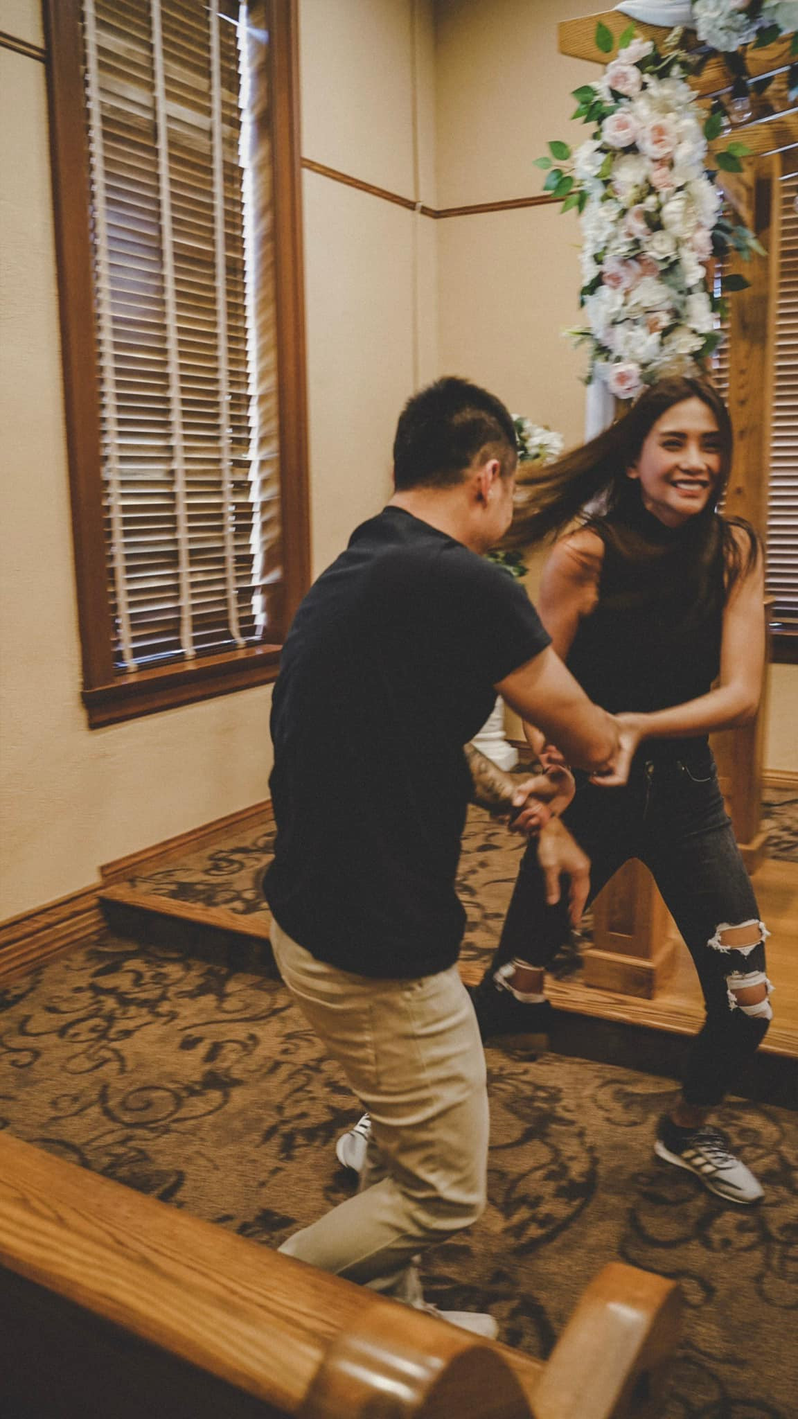 Võ Hoàng Yến đăng kèm loạt ảnh hài hước như đang 'thượng cẳng chân, hạ cẳng tay' với ông xã. Cô chú thích: "Một phong cách kết hôn rất chi là Hoàng Yến và không giống ai. Vui vẻ lên, quậy lên nào".