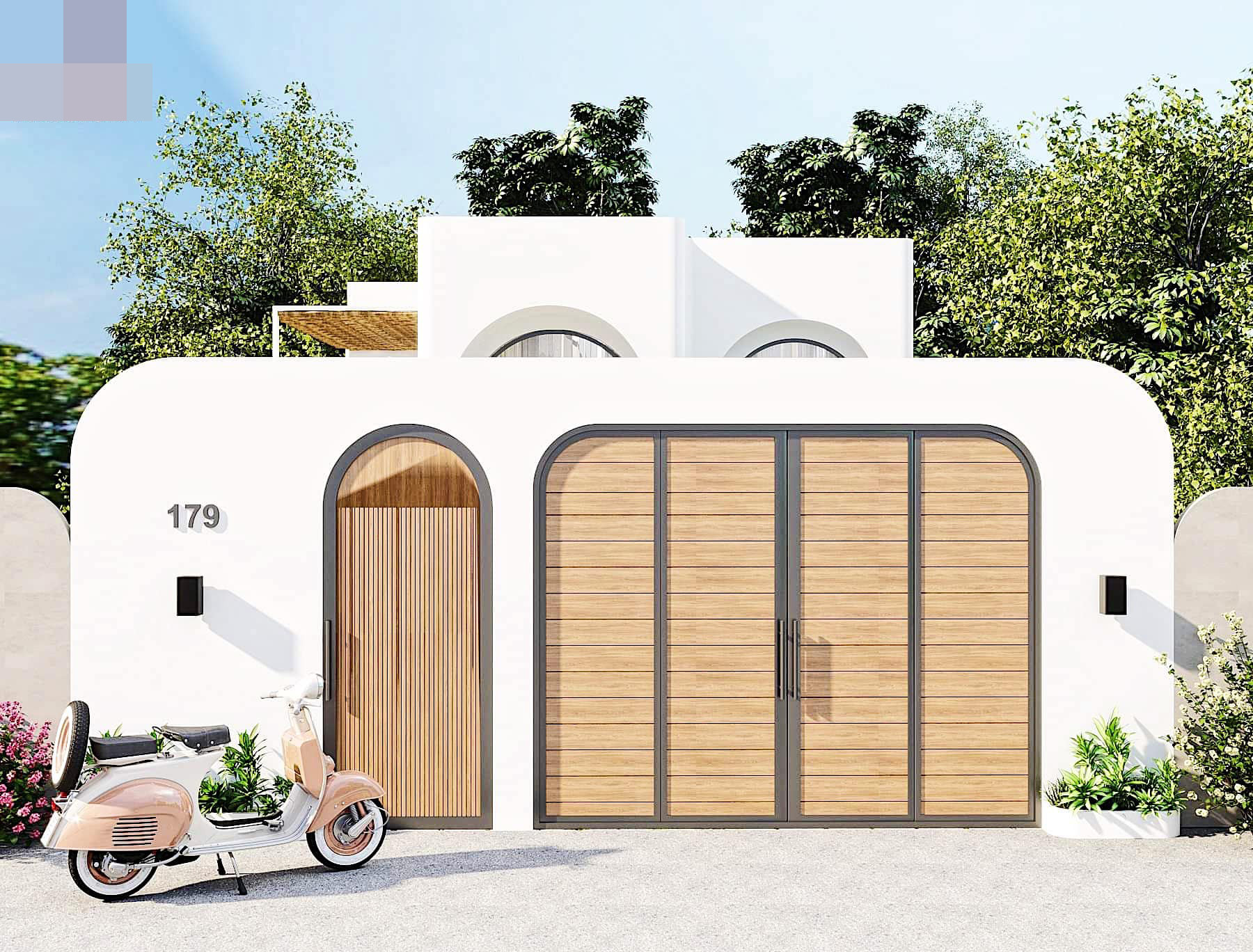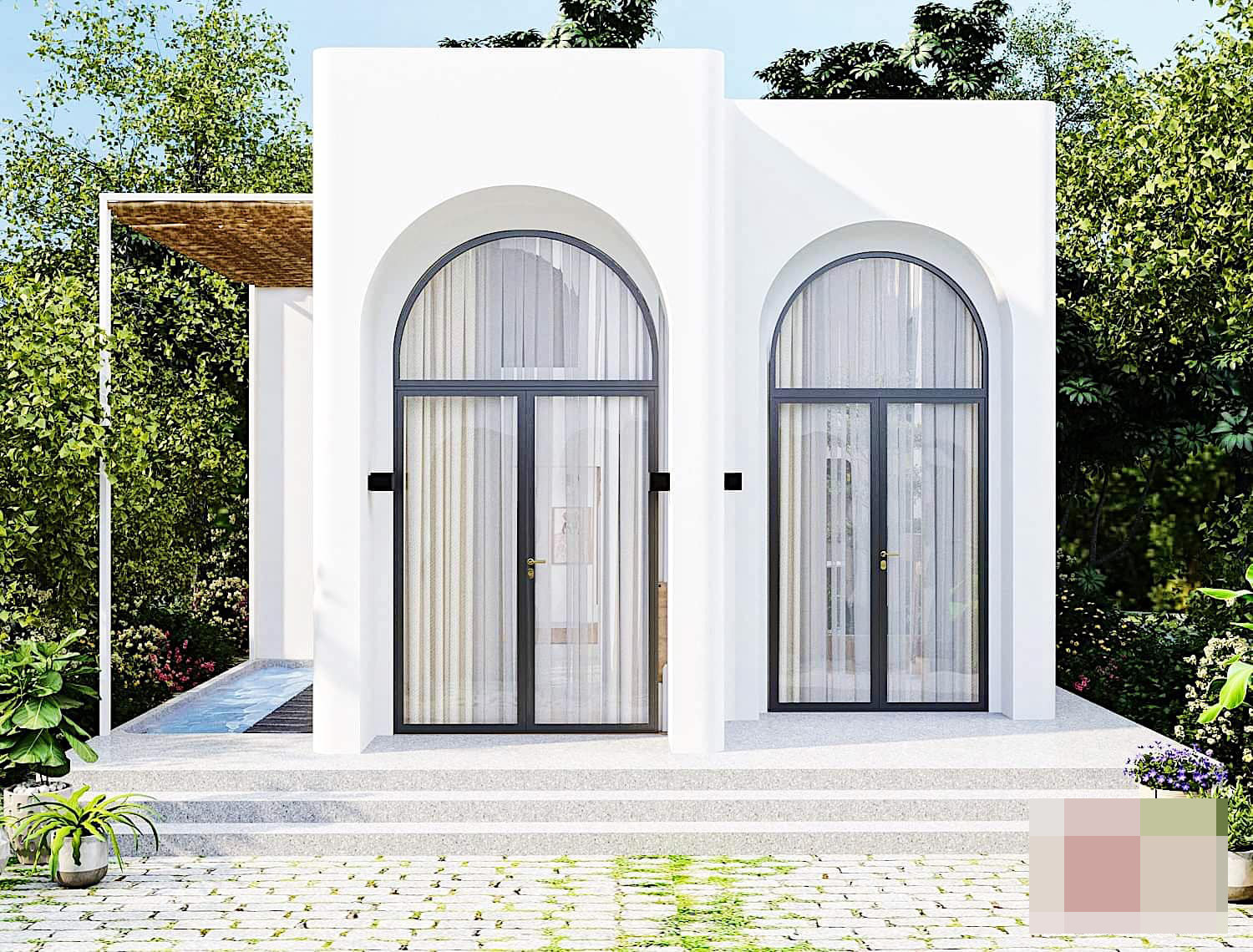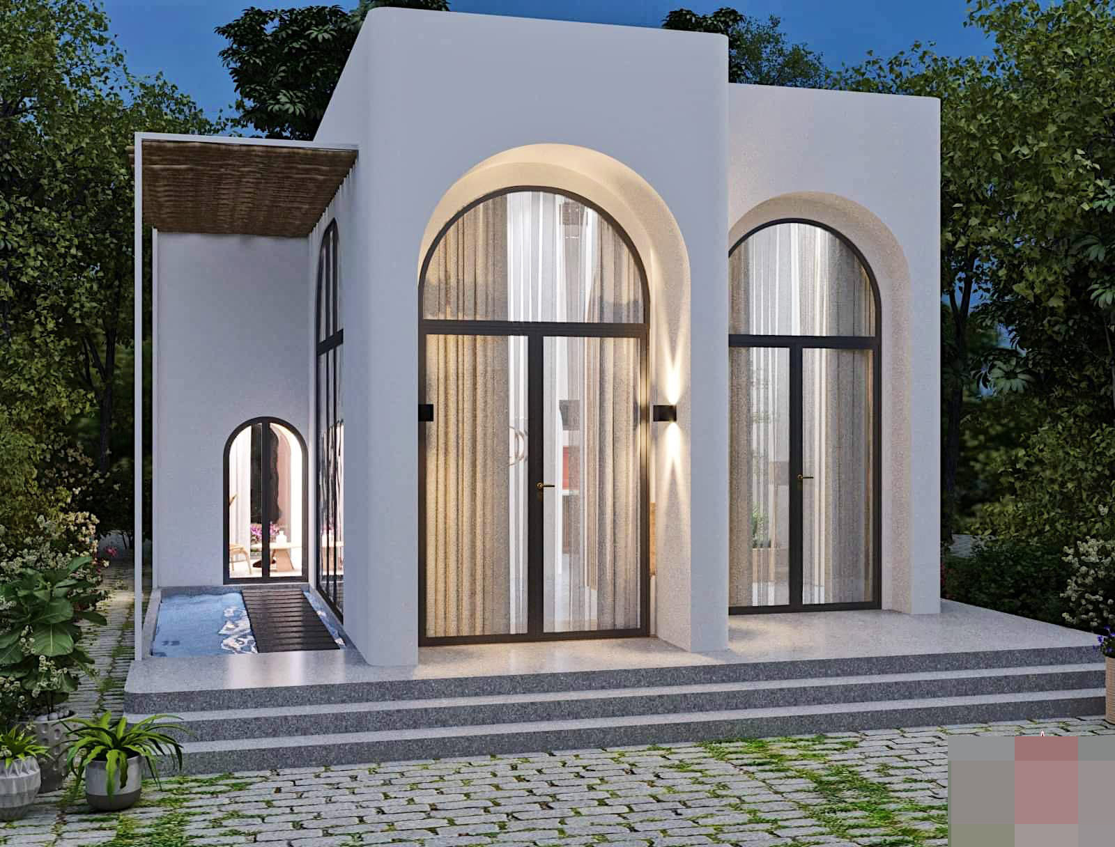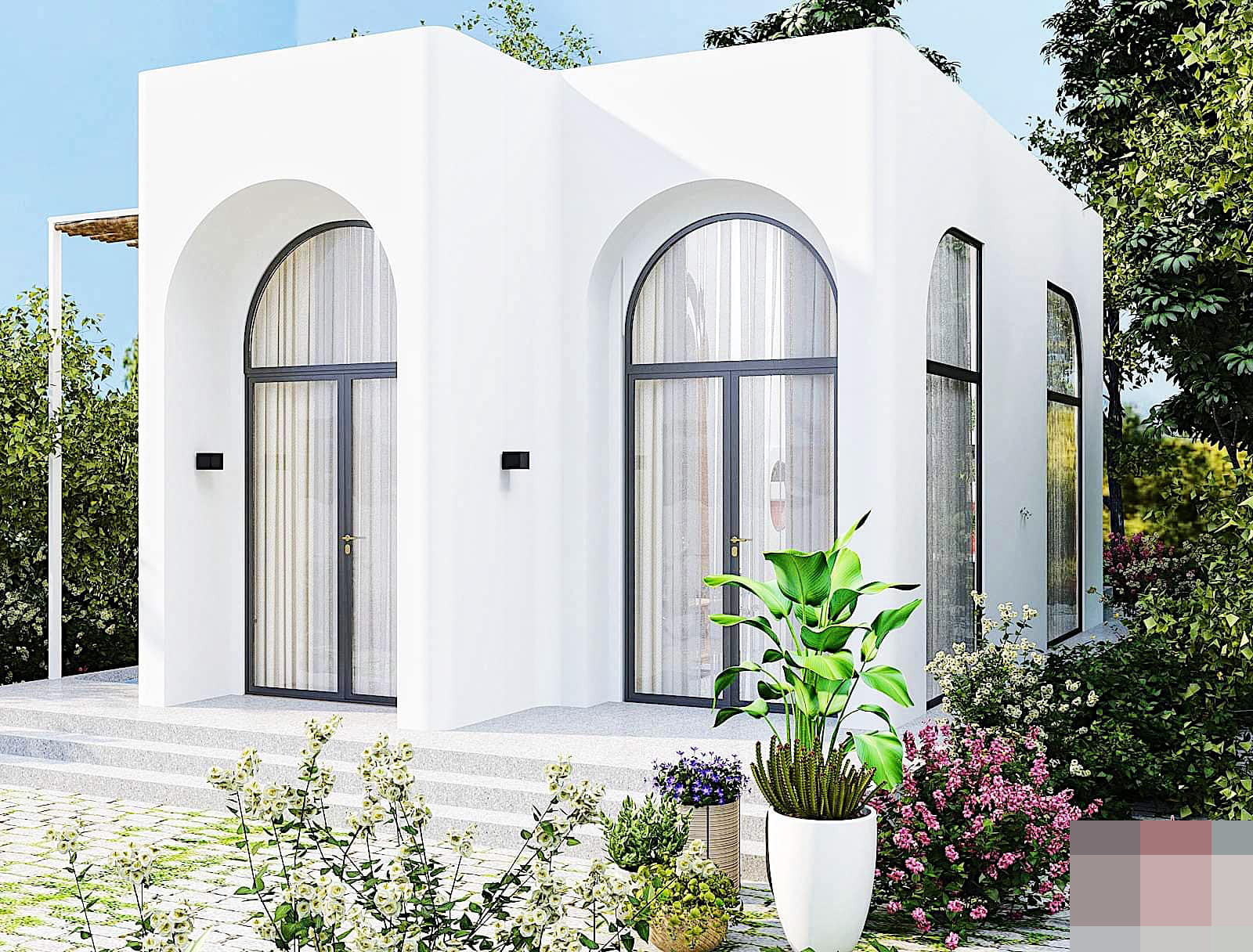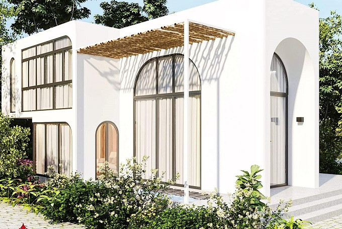 Ngôi nhà mái bằng mang thiết kế độc đáo, ấn tượng với hệ cửa vòm cao, lấy tối đa ánh sáng vào bên trong.